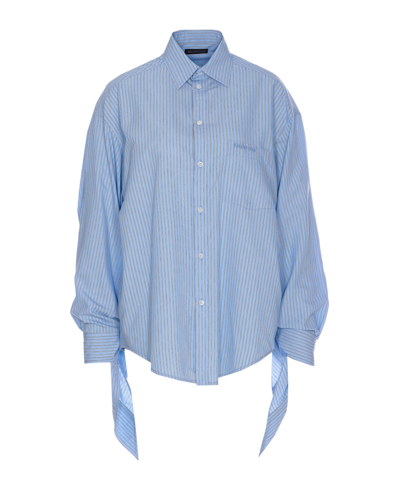 Balenciaga light blue knotted cuff blouse, buttons closure, long sleeves, button on cuffs, striped, one pocket with embroidered logo, regular collar Composition: 87% Viscose, 13% Polyamide, 100% Polyester