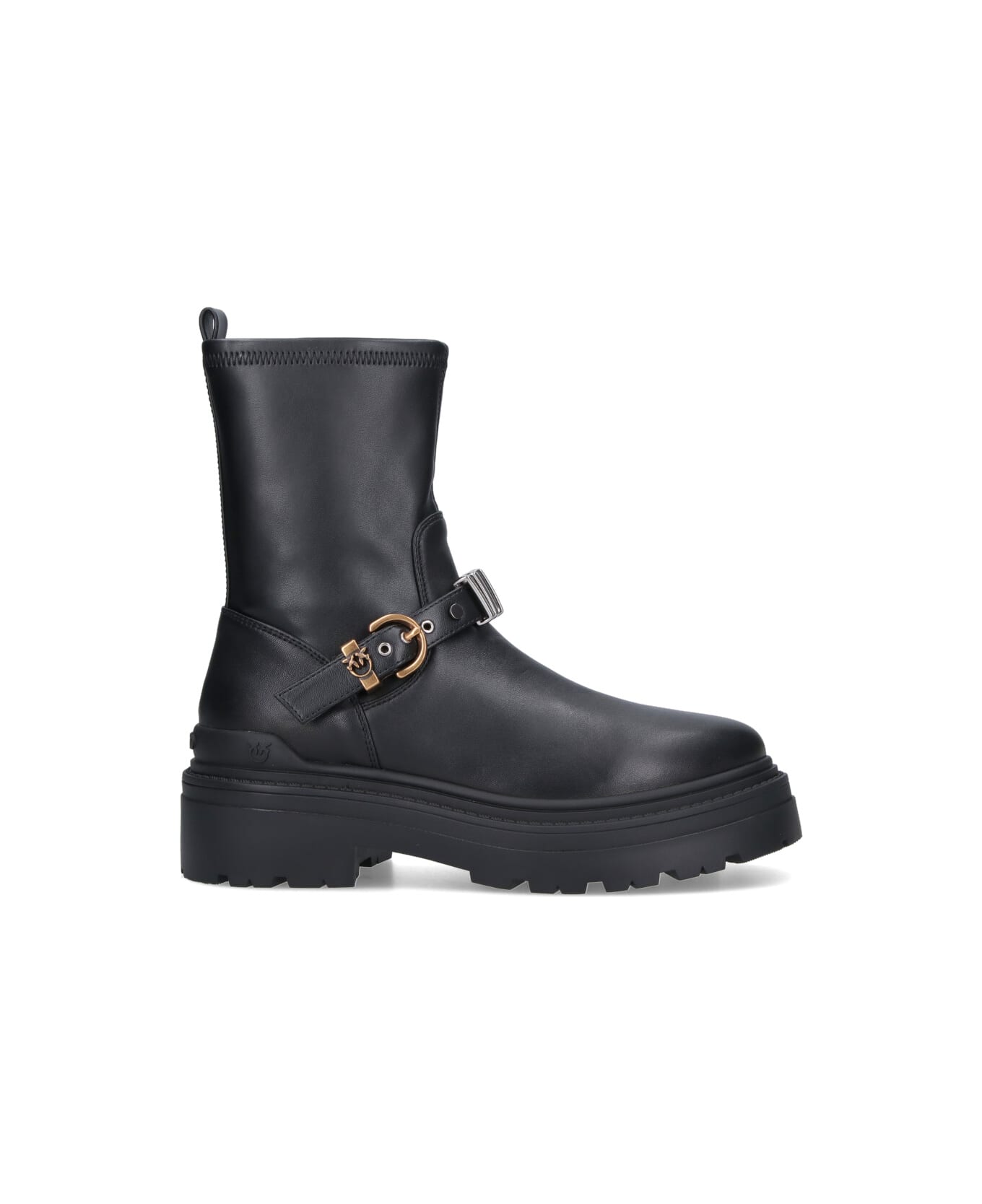 Pinko 'Mia 27' ankle boots in black leather blend with round toe, zip closure, front strap detail, rubber sole.