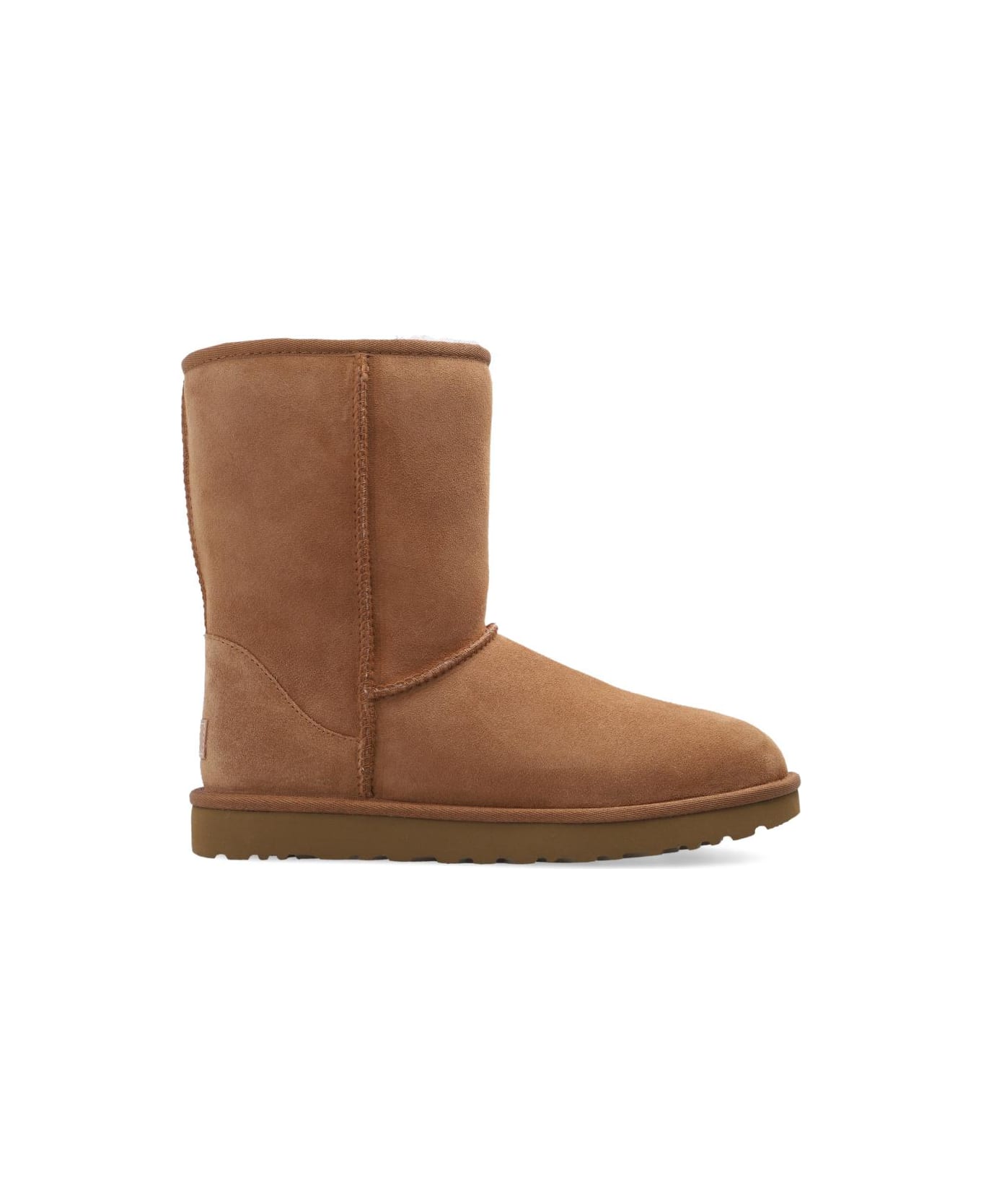Brown 'Classic Short II' snow boots from UGG. Made of sheep leather, this pair features a logo patch at the back and a brown rubber sole.