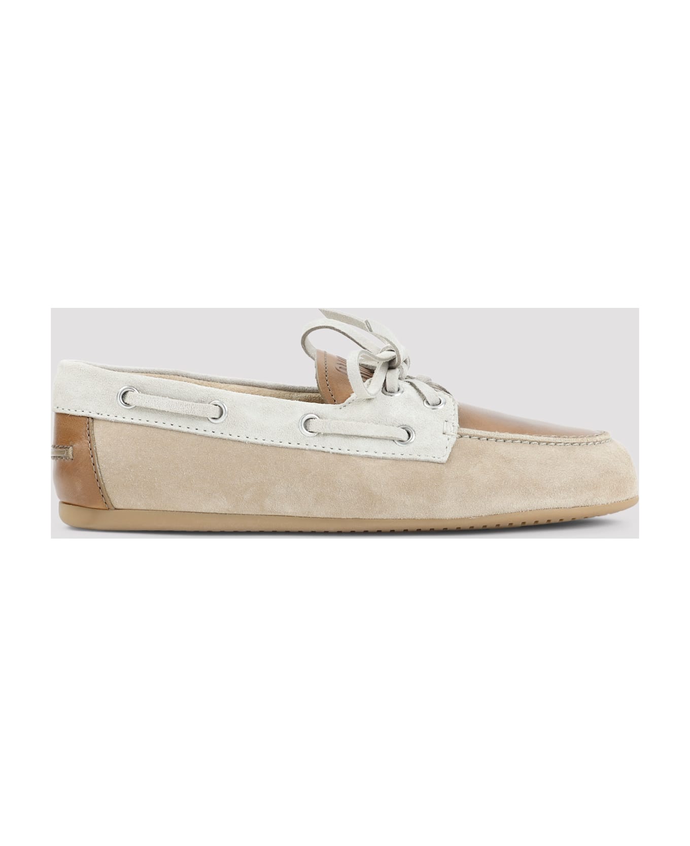 Miu Miu Brown Calf Leather Loafers. Boat-loafer-inspired design, crafted from brown and beige suede leather, featuring a round toe, leather lace-up fastening, reinforced heel, leather lining, insole, and flat rubber outsole.