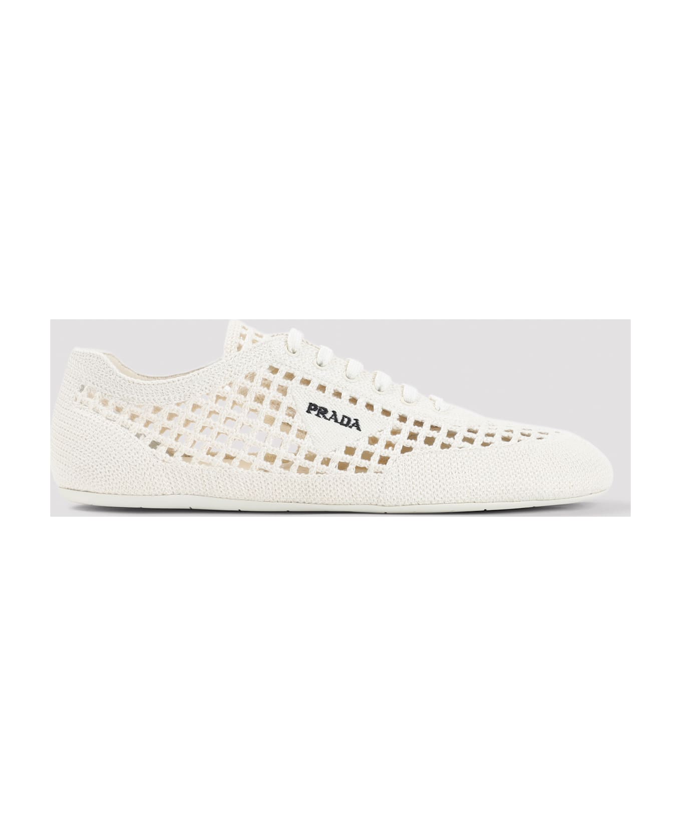 Prada Collapse Ivory Cotton Sneakers. A crocheted vamp with mesh detailing, crafted from ivory cotton, featuring a round toe, lace-up fastening, an embroidered triangle logo on the side, leather insole, and a flat rubber outsole.