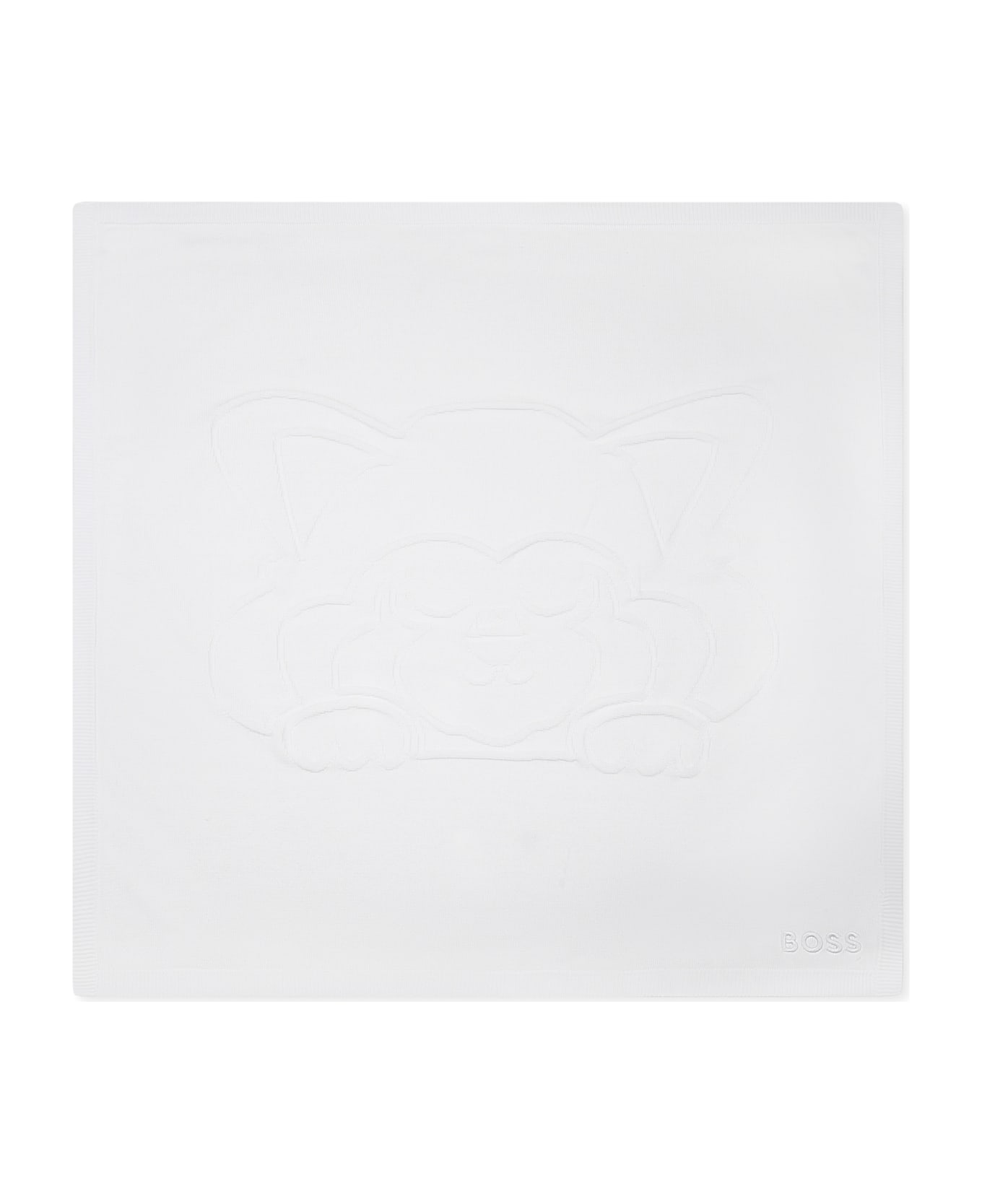 White knitted blanket; embellished with jacquard logo and panda on the front.