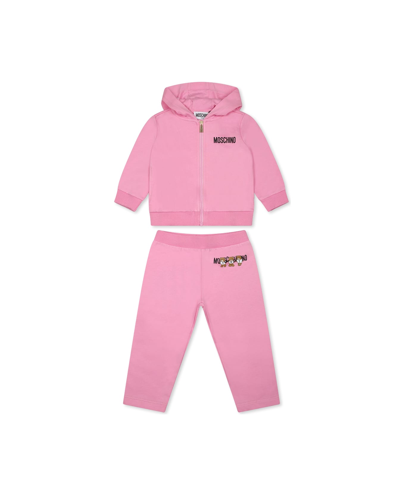 Pink suit from the Moschino Kids brand, in fleece cotton, composed of a sweatshirt and trousers. Long-sleeved sweatshirt, with hood, front zip closure, siede pockets, ribbed cuffs and hem. It is embellished with logo on the chest and with three Teddy Bears and logo on the back. Trousers with an elastic waist, embellished with three Teddy Bears and a logo.