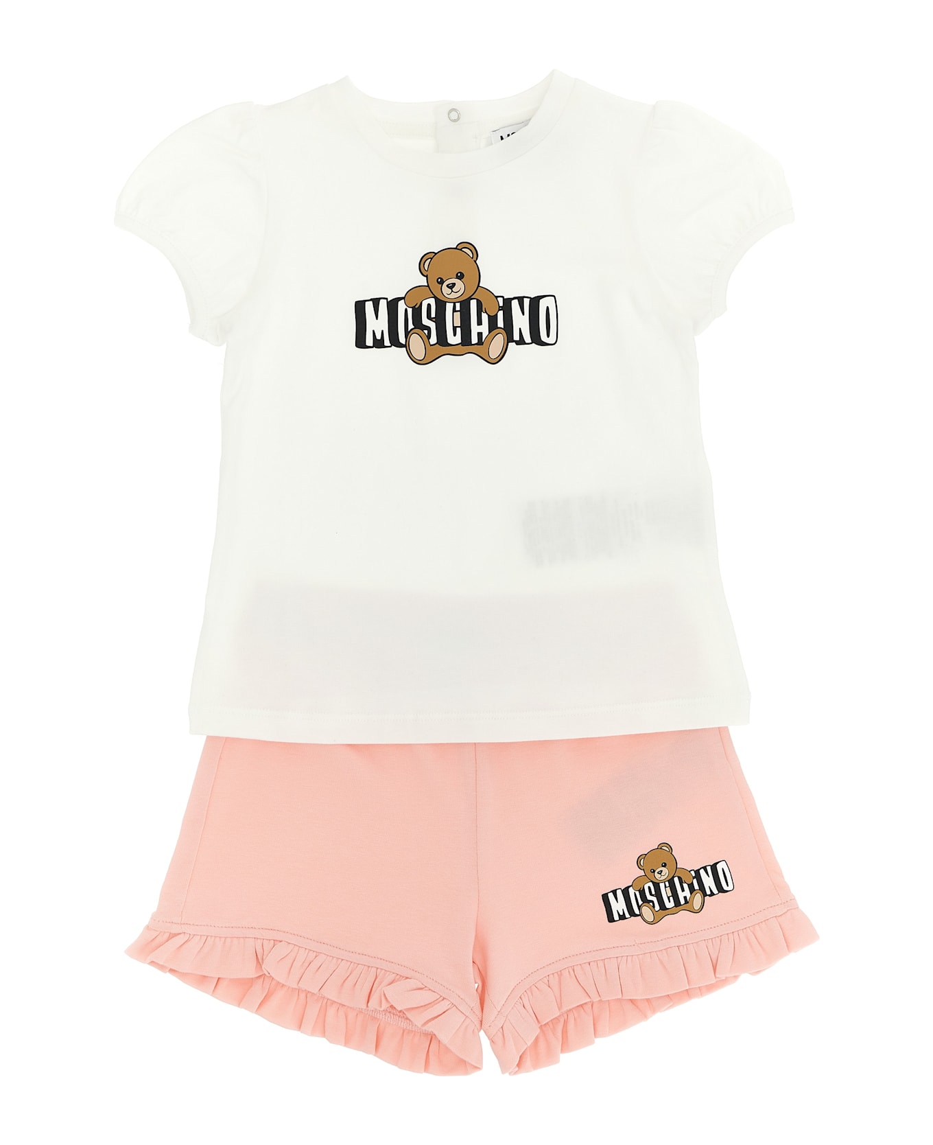 Cotton jersey suit with front 'Moschino Teddy Bear' print, consisting of crewneck t-shirt with snap buttons on the back, short puff sleeves and shorts with elastic waistband and ruffles on the bottom of the leg.