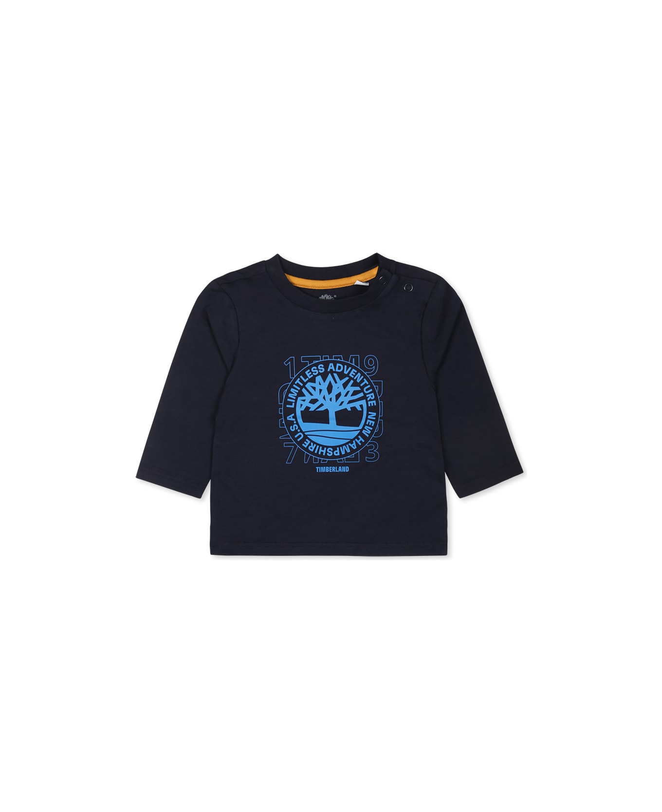 Blue organic cotton t-shirt, long sleeves, with ribbed crew neck and snap button closure on the shoulder. It is embellished with tree print and logo on the front.