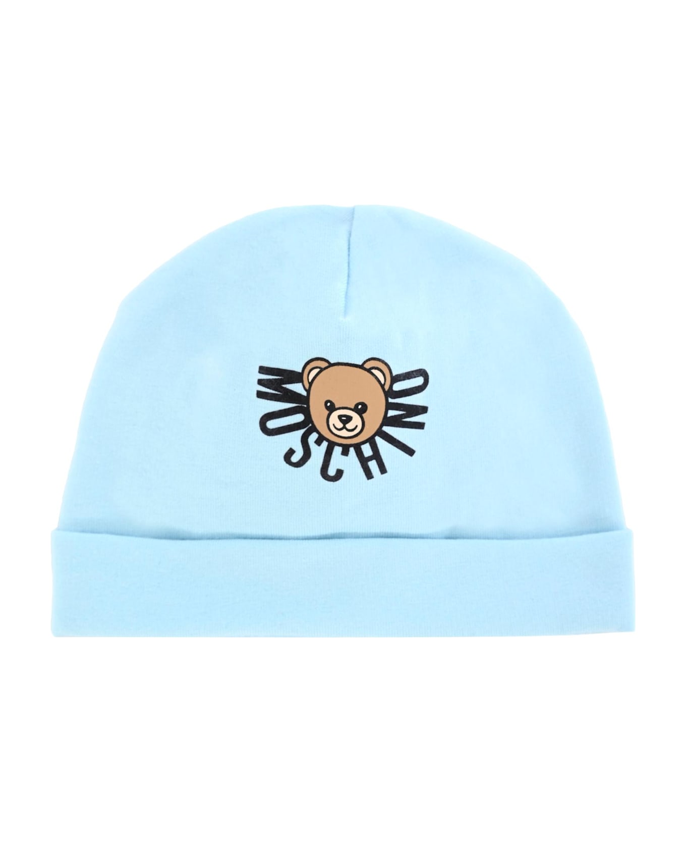 Light blue hat from the Moschino Kids brand, made of mixed cotton, with cuff; it is embellished with Teddy Bear and circular logo.