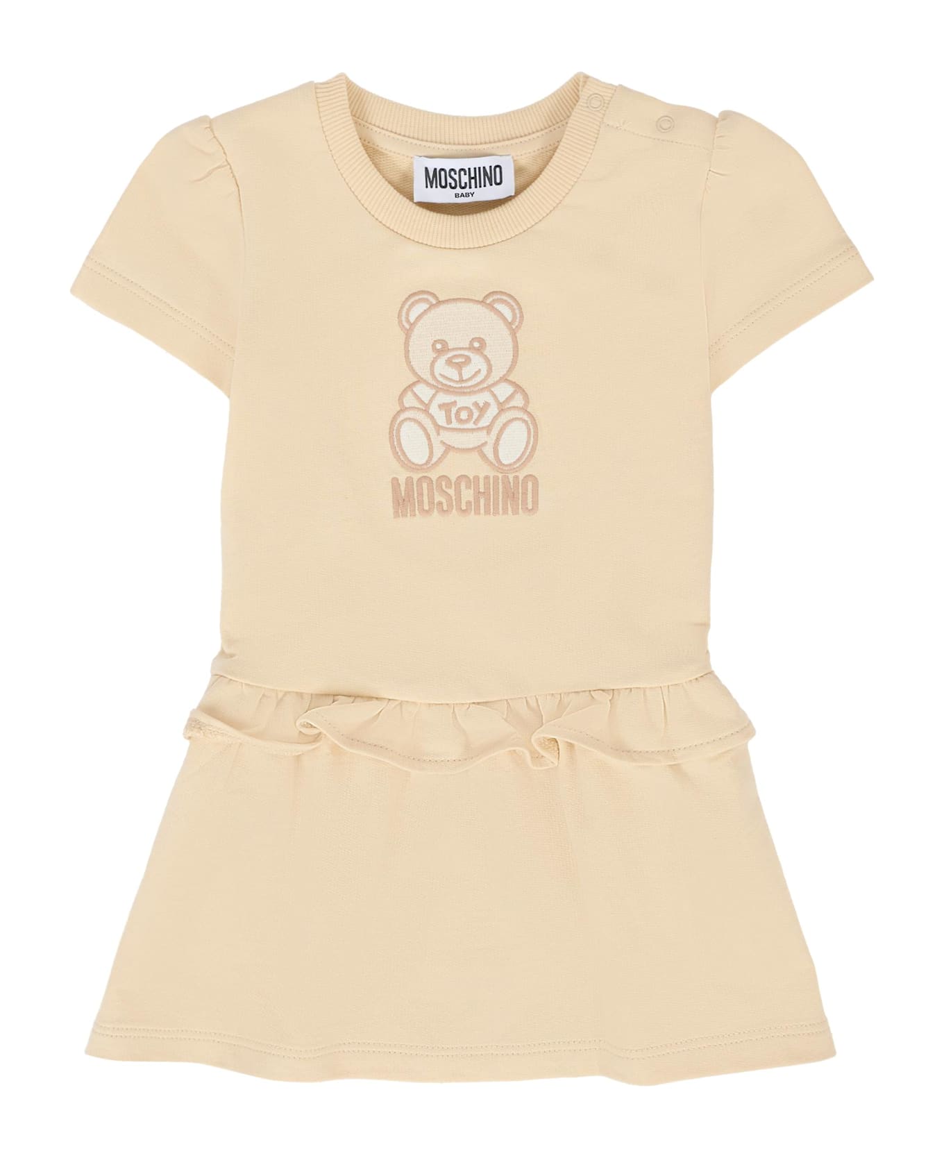 Beige dress from the Moschino Kids brand, made of brushed cotton, with short sleeves, a ribbed crew neck, snap button fastening on the shoulder, ruffle and flounce at the bottom. It is embellished with an embroidered Teddy Bear and logo on the front.