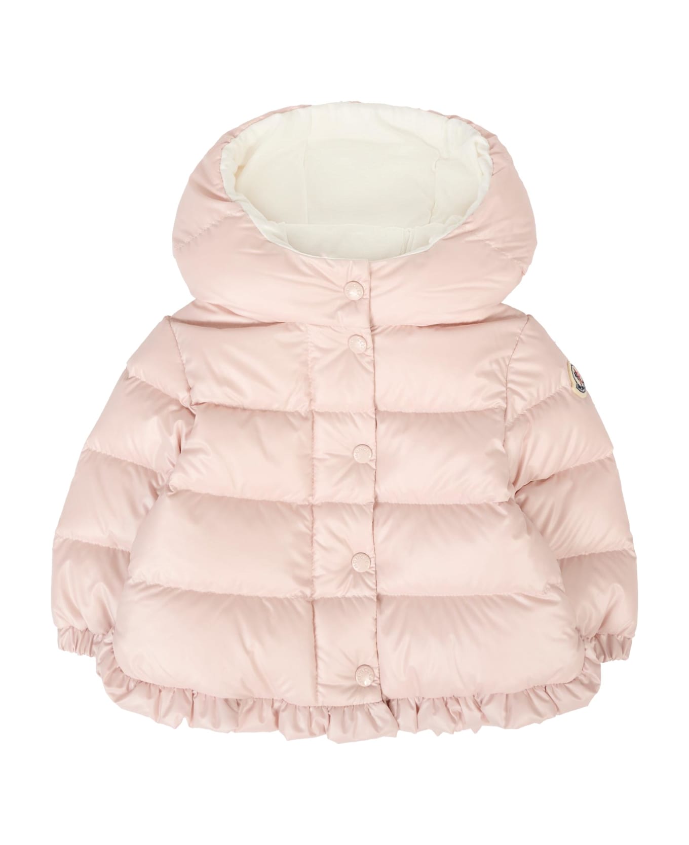 Heavyweight pink quilted and padded down jacke,t with long sleeves, a hood, a zip and snap front closure, side button pockets, and elasticated cuffs and hem; made from recycled polyester. It is embellished with an iconic patch applied on the sleeve.
