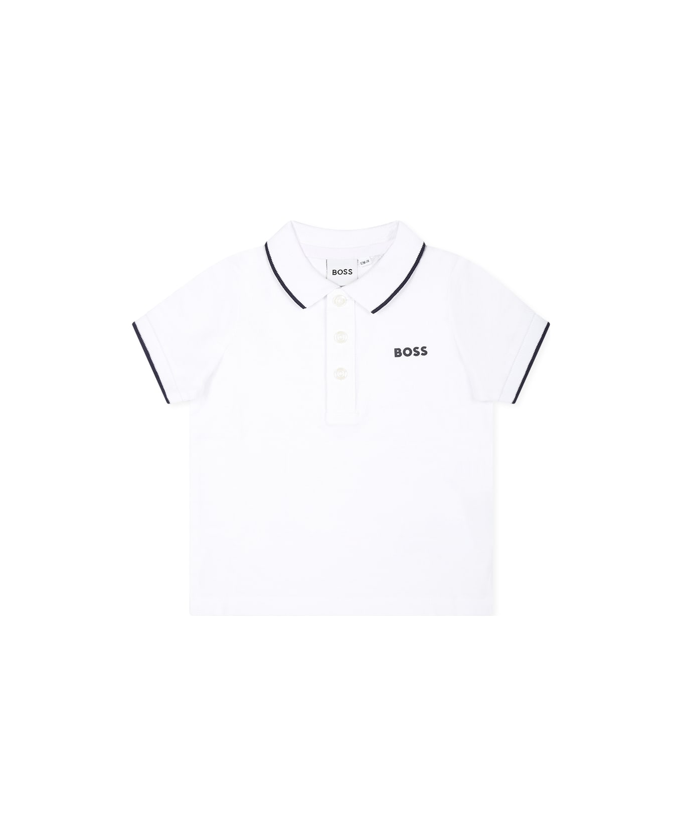 White cotton piqué polo shirt, short sleeves, with pointed collar, front button closure, ribbed finishes and blue profiles. It is embellished with rubberized logo on the chest.