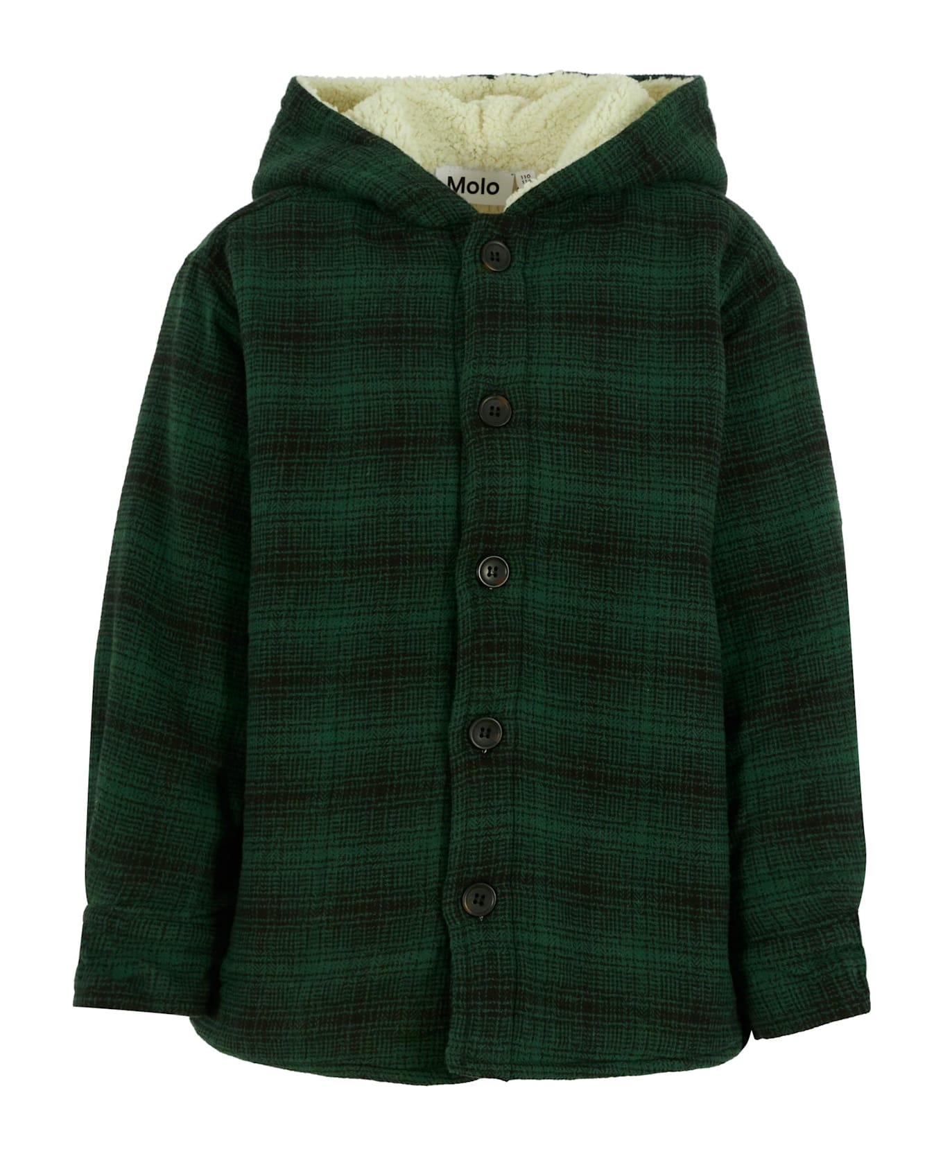 Green organic cotton jacket, with soft eco-friendly shearling lining, long sleeves, hood and front button fastening.