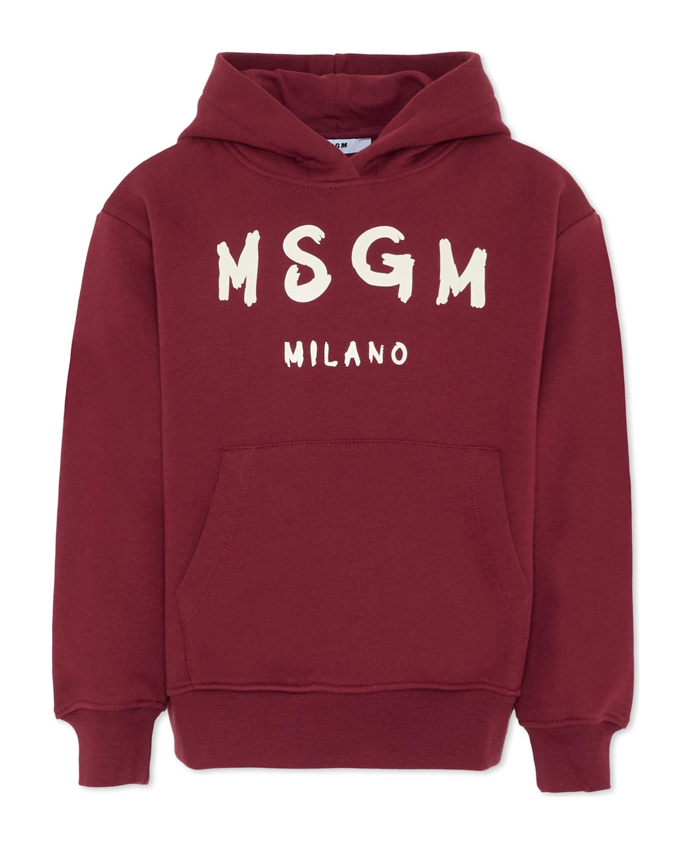 Burgundy sweatshirt in fleece cotton, long sleeves, with hood, front pocket, ribbed cuffs and hem. It is embellished with a ivory logo print on the front.