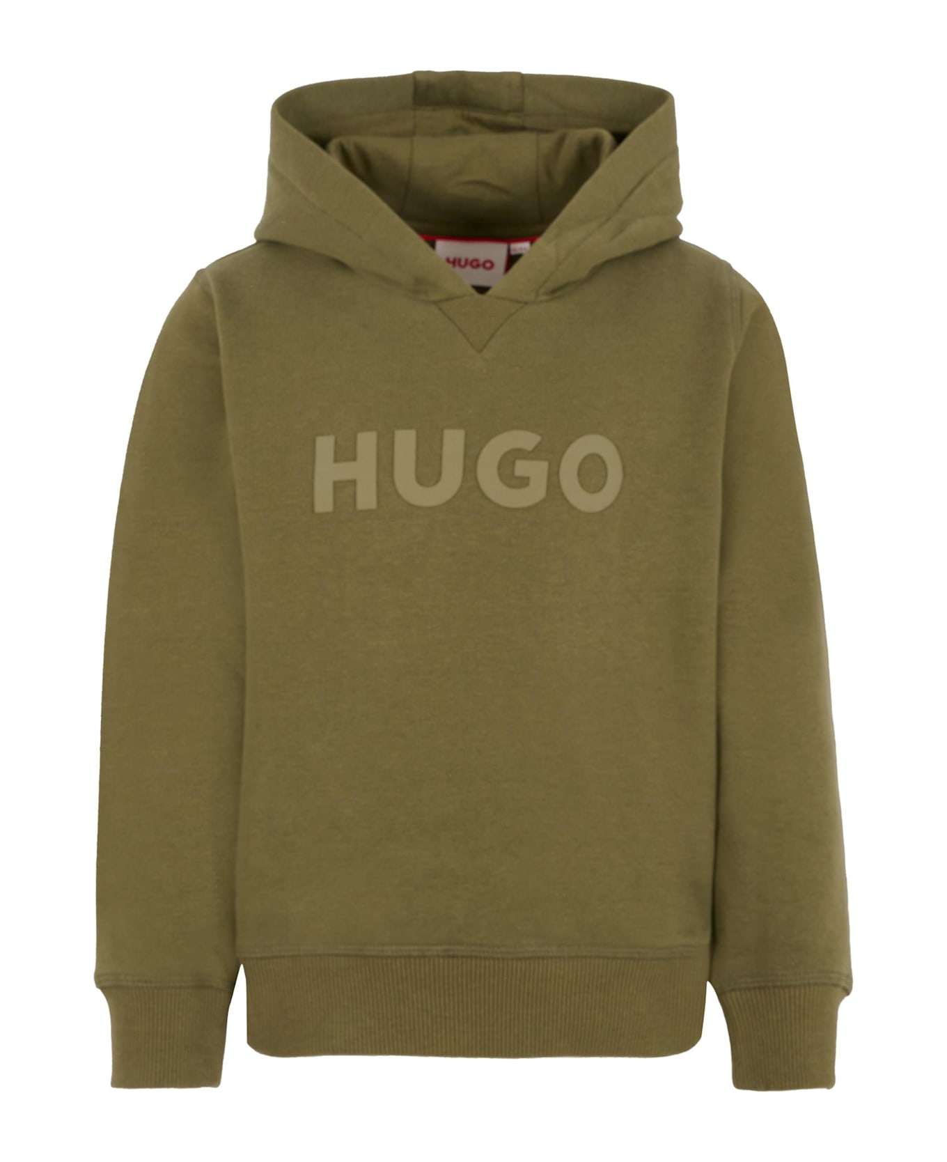 Green plush cotton sweatshirt with hood, long sleeves, ribbed hem and cuffs. It is embellished with logo on the front.
