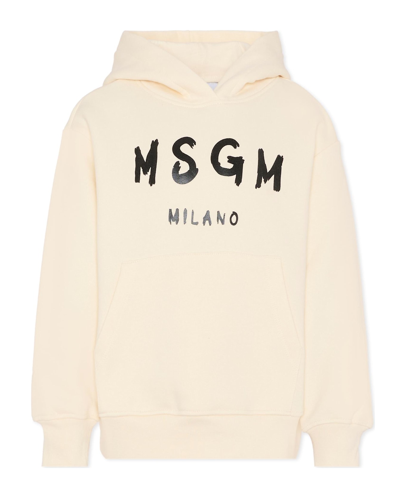 Ivory sweatshirt in fleece cotton, long sleeves, with hood, front pocket, ribbed cuffs and hem. It is embellished with a black logo print on the front.