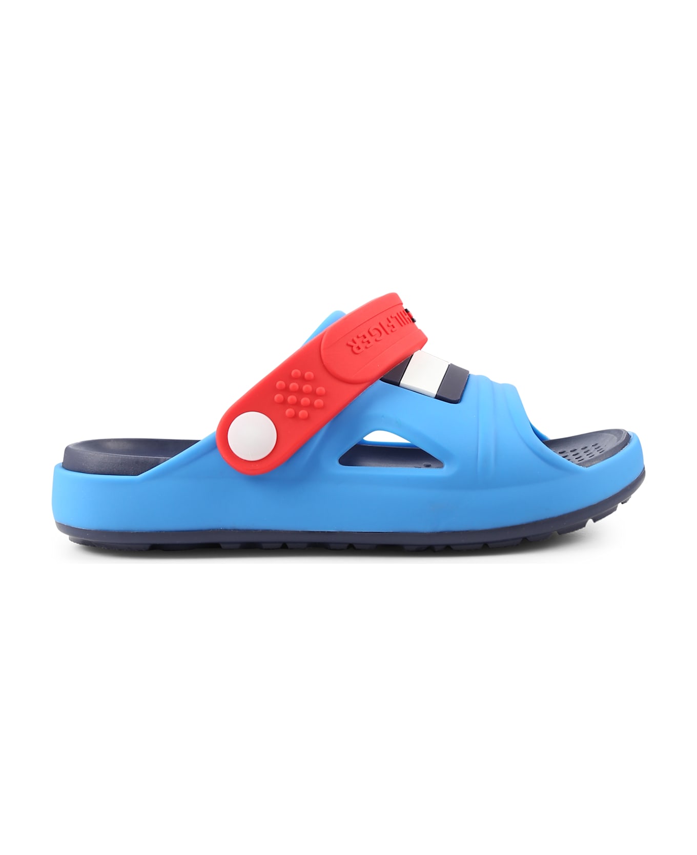 Blue sandals with rubber sole and heel strap. They are embellished with color block pattern, logo on the back and flag on the top.