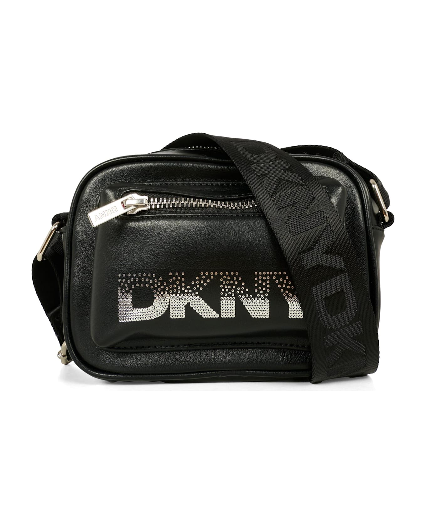 Black bag with zippered closure and adjustable shoulder strap on the top and zippered pocket on the front. It is embellished with silver logo on the front.