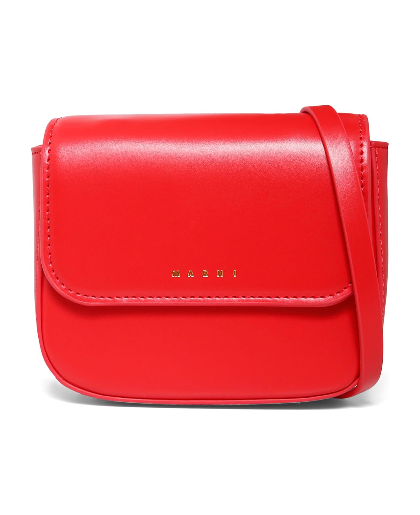 Red eco-leather bag, with front flap, magnetic button and adjustable shoulder strap. It is embellished with a front logo.