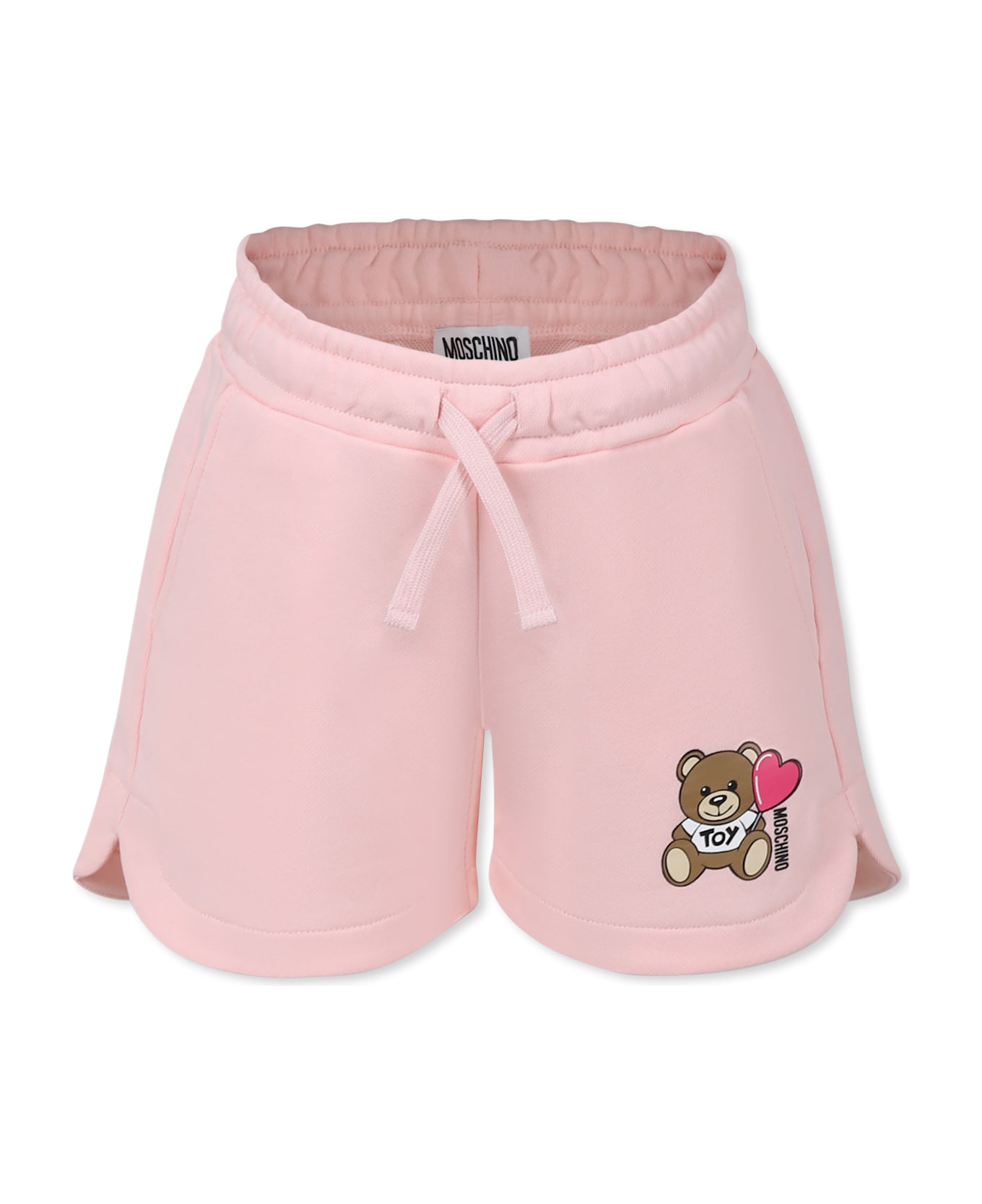 Pink shorts from the Moschino Kids brand, in brushed cotton, with elasticated waist, drawstring and side pockets. They are embellished with Teddy Bear, heart and logo printed on the front.