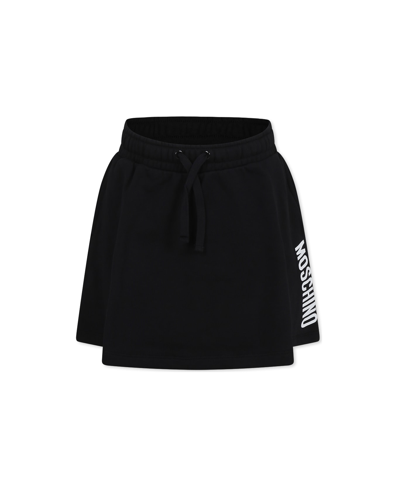 Black skirt from the Moschino Kids brand, made of brushed cotton, with elastic waist, drawstring and side pockets. It is embellished with white logo on one side.