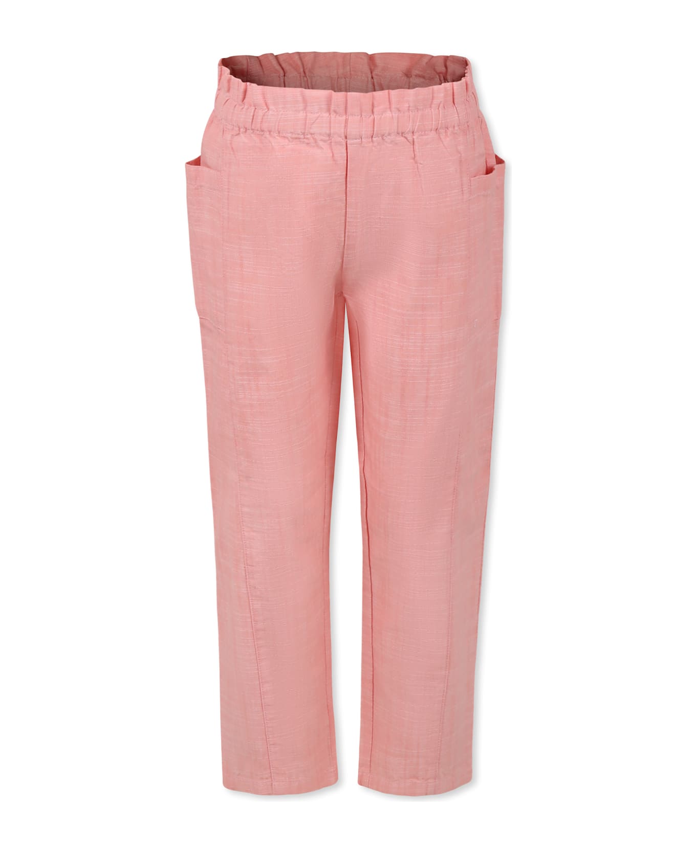 Pink cotton trousers with elasticated waist and patch pockets on the sides. They are embellished with iconic embroidered cherries on one leg.