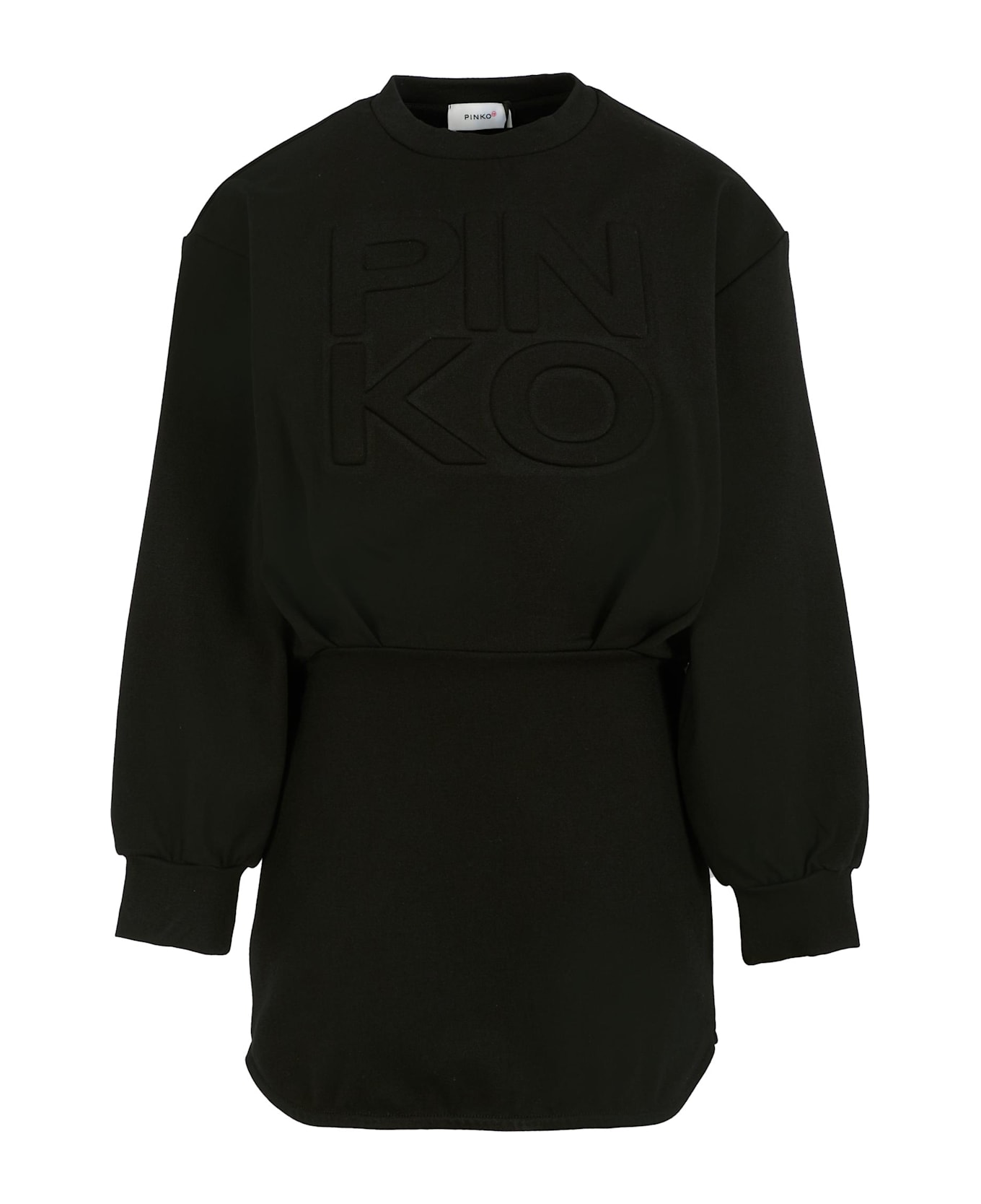 Black long-sleeved dress with a crew neck and elastic back. It is embellished with a padded logo in relief on the front.