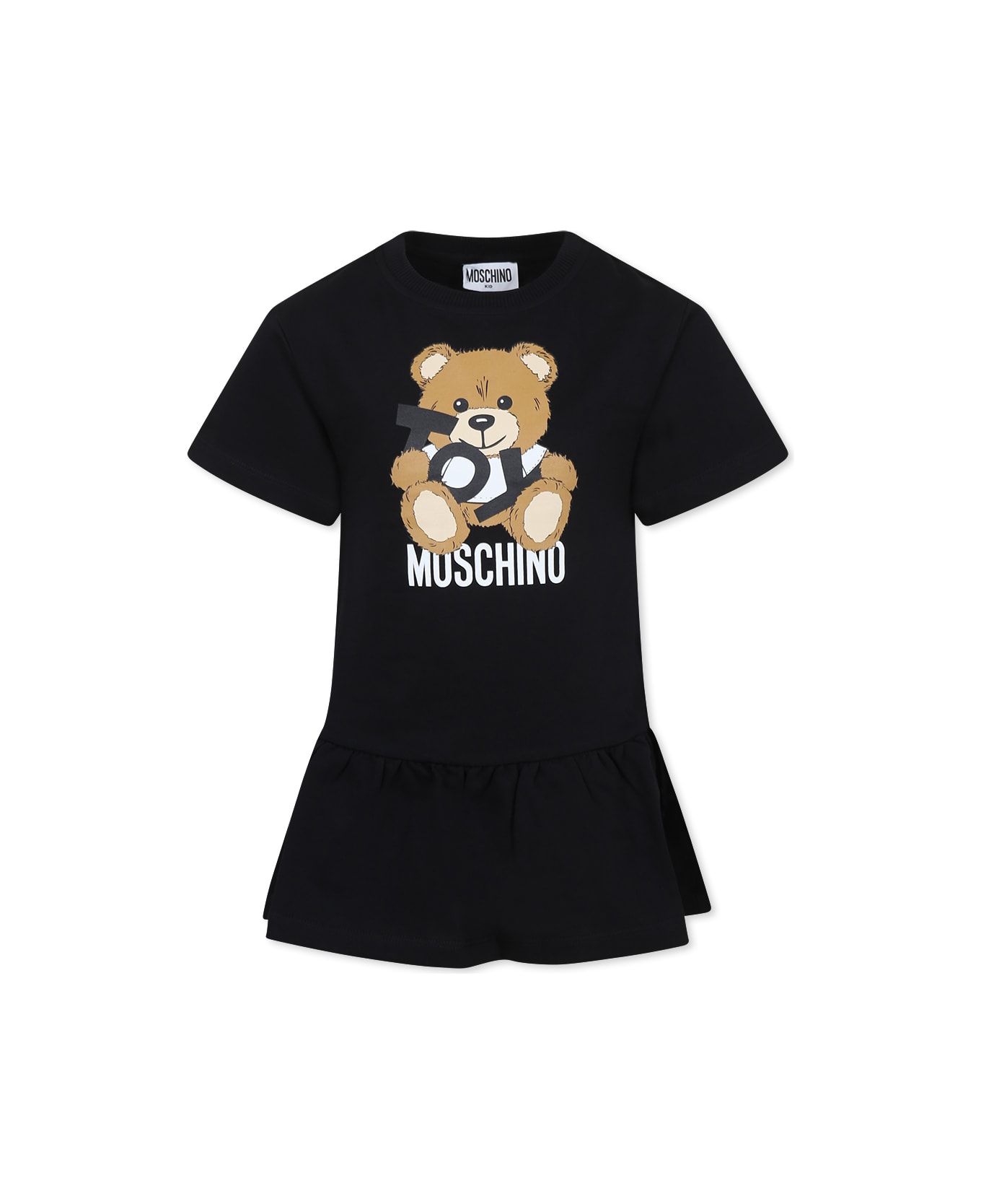 Black dress from the Moschino Kids brand, in brushed cotton, with short sleeves, a ribbed crew neck and a flounce at the bottom. It is embellished with Teddy Bear, Toy writing and logo printed on the front.