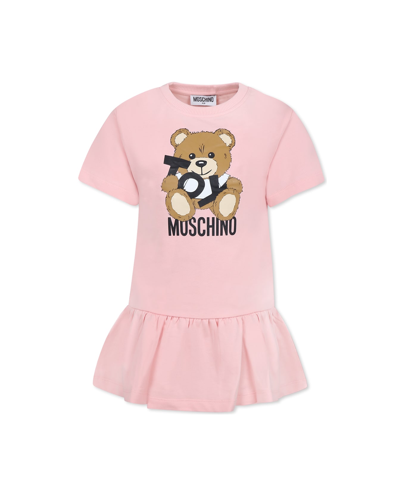 Pink dress from the Moschino Kids brand, in brushed cotton, with short sleeves, a ribbed crew neck and a flounce at the bottom. It is embellished with Teddy Bear, Toy writing and logo printed on the front.