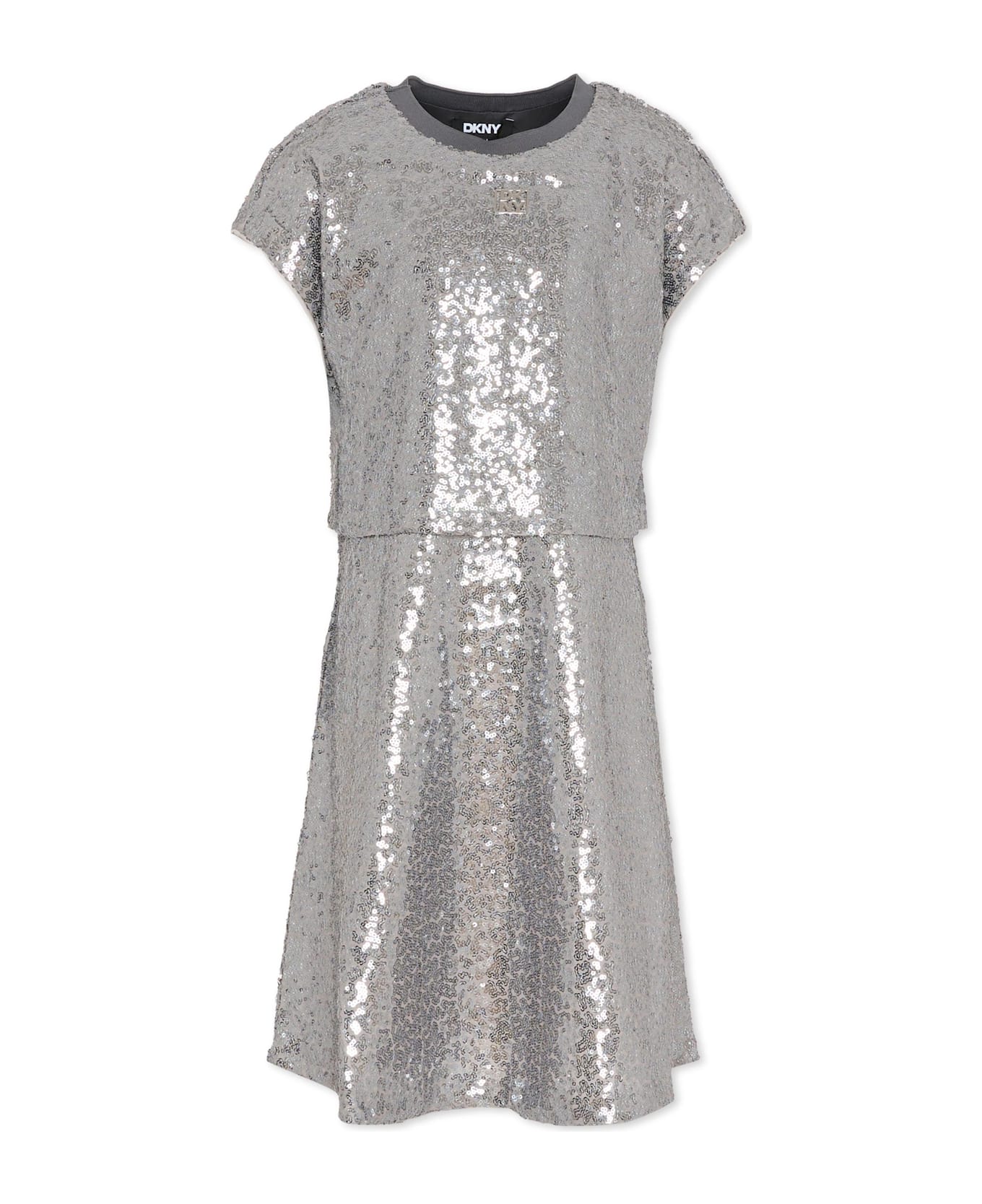 Silver sequin dress with short sleeves and a ribbed crew neck. It is embellished with metal logo on the front.