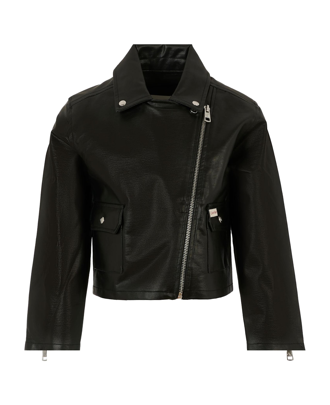 Black faux leather jacket, long sleeves, with lapel collar, zip front closure, flap pockets with button on the front and zip on the sleeves. It is embellished with a logo patch on the front.