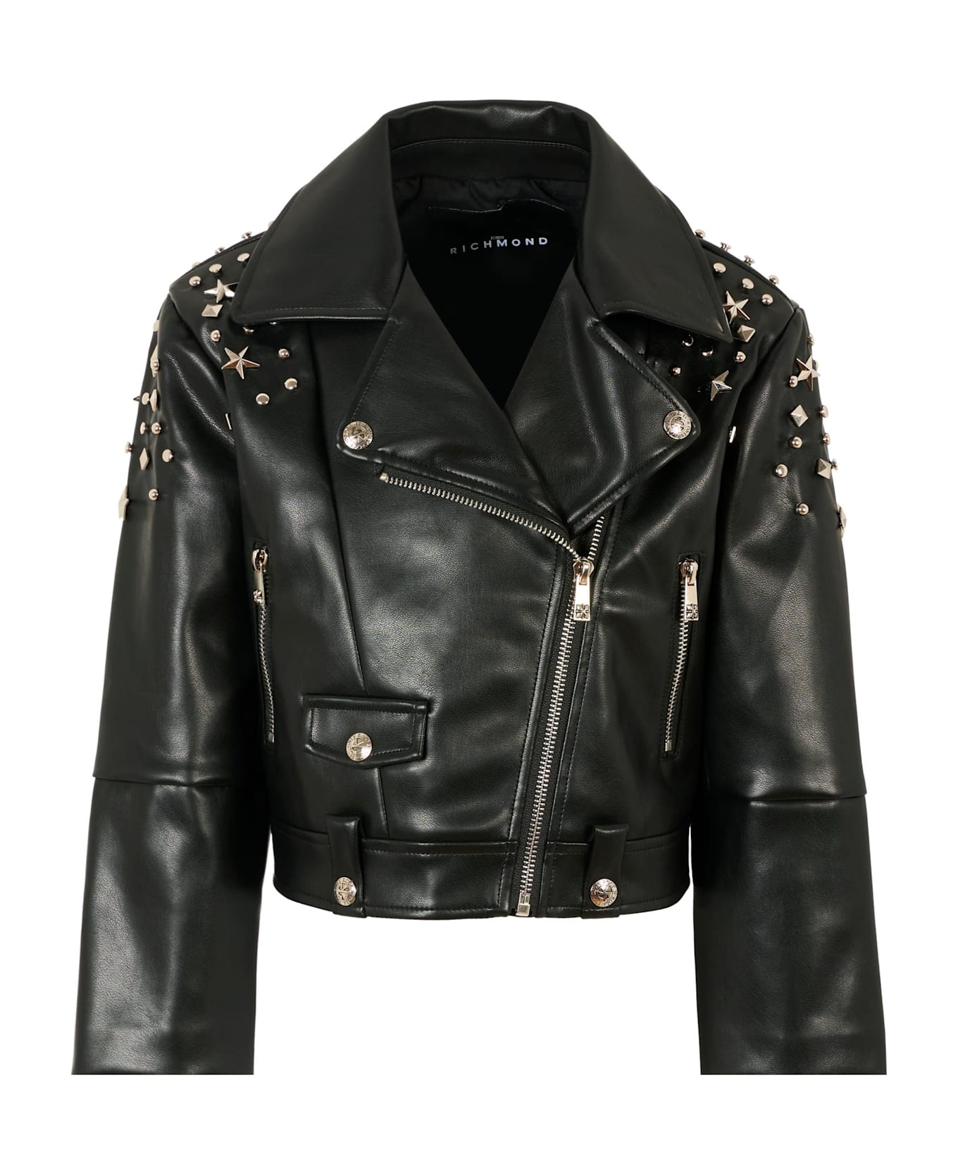 Black faux leather jacket with long sleeves, a lapel collar, a front zip fastening, and side zip pockets. It is embellished with stars and studs on the shoulders and sleeves.