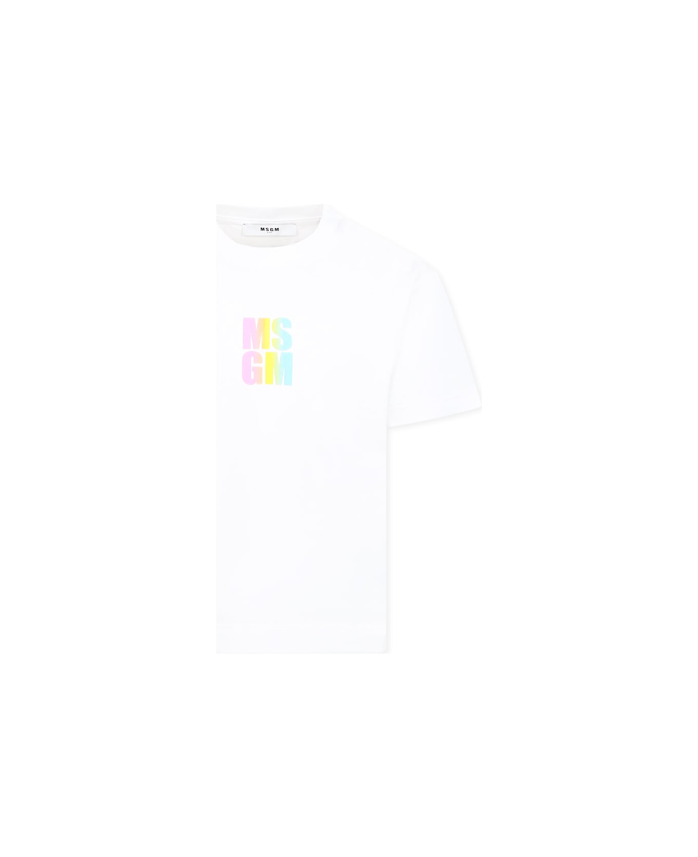 White cotton t-shirt, with short sleeves and ribbed crew neck. It is embellished with multicolor logo on the front.