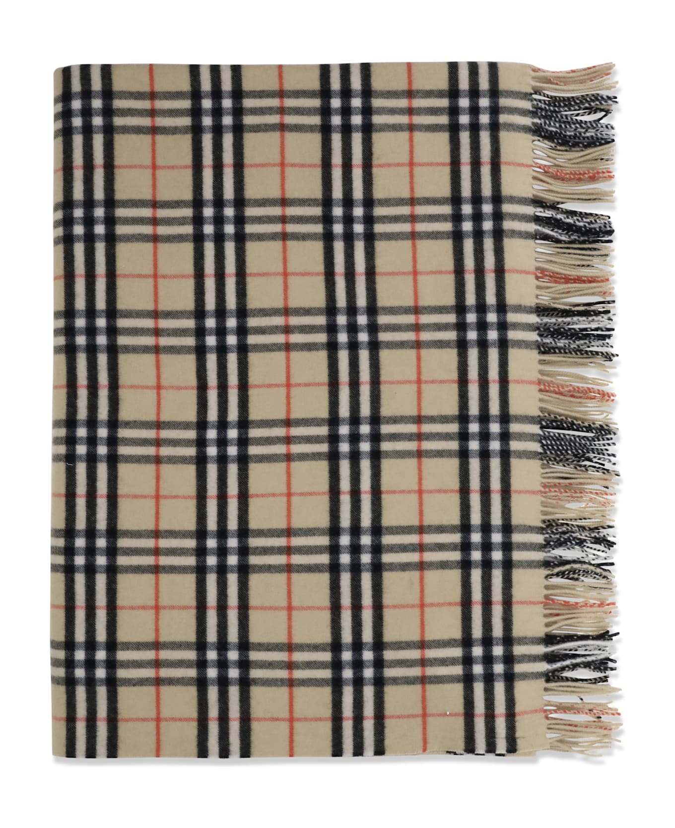 The cashmere blanket by burberry crafted in scotland and woven with the iconic check pattern in classic sand beige. the cashmere is processed in a historic scottish mill, washed in local spring water, and brushed to achieve an exceptionally soft finish. its rectangular design is completed with fringed ends, offering timeless elegance and enveloping comfort.