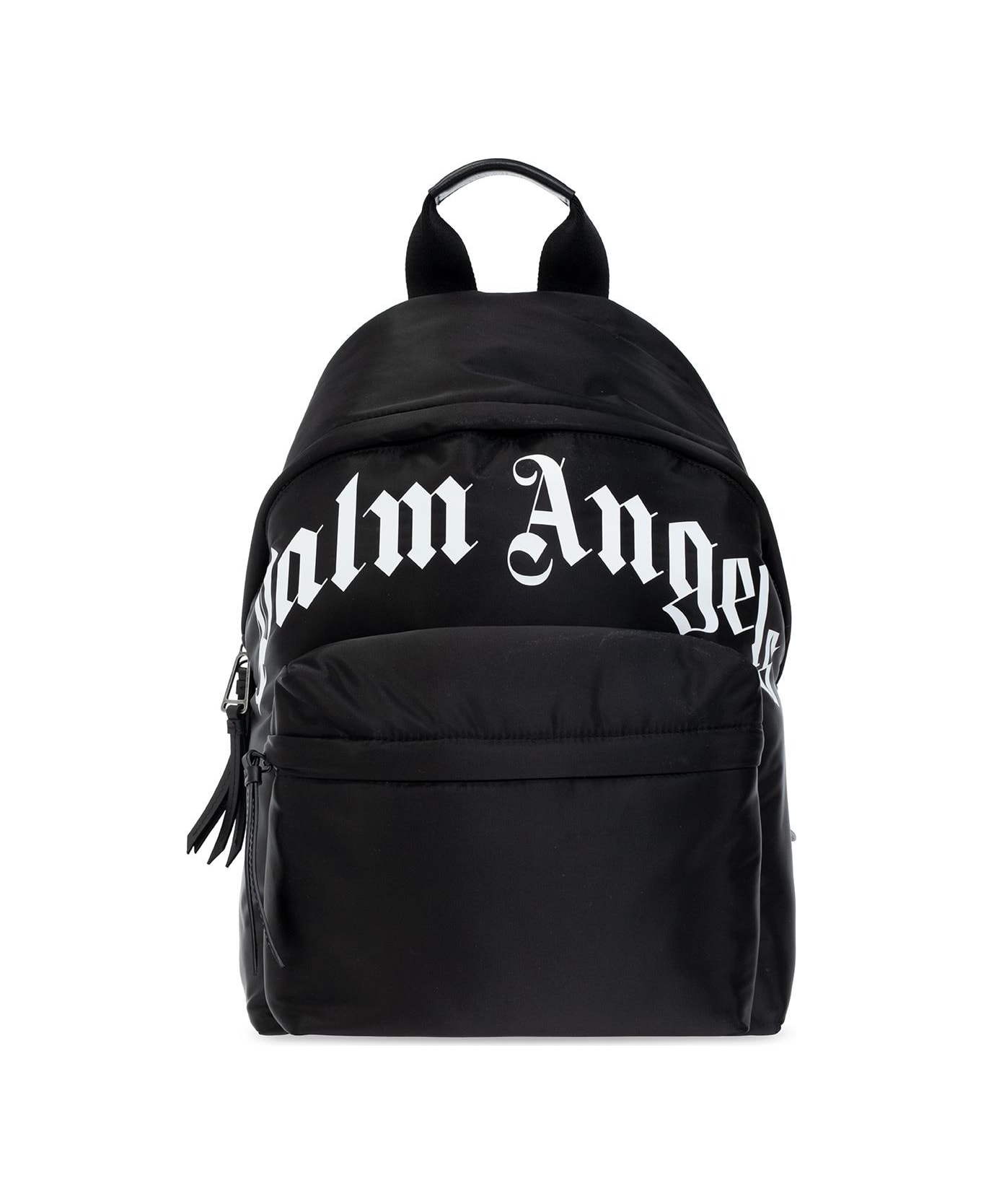 Black backpack from Palm Angels. Crafted with a shimmering finish, this design features a two-way zip fastening, a white logo print, a zip pocket on the front, a top handle, adjustable shoulder straps, antiqued silver-tone metal hardware and one internal