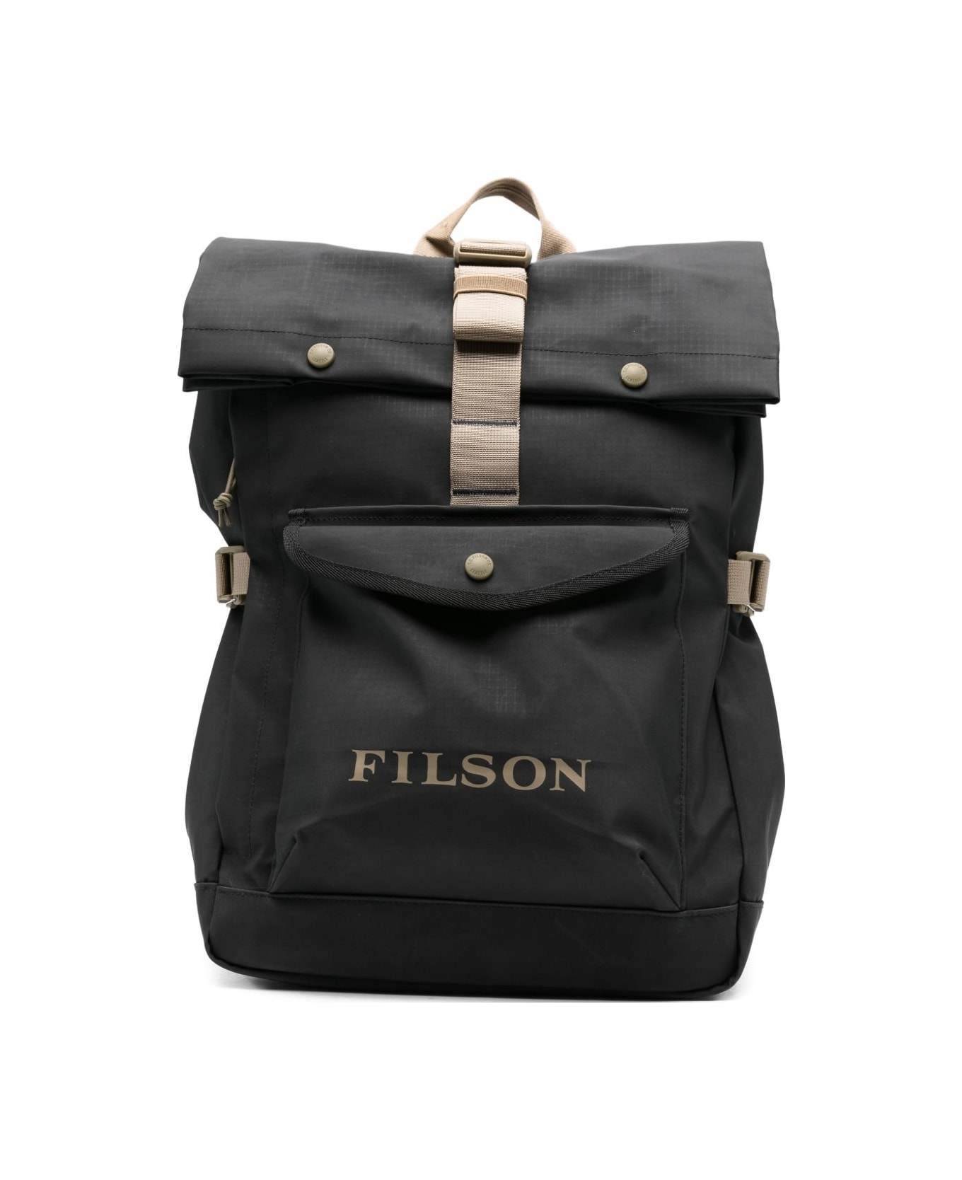 black roll-top closure buckle fastening straps front pouch pocket printed logo adjustable shoulder straps