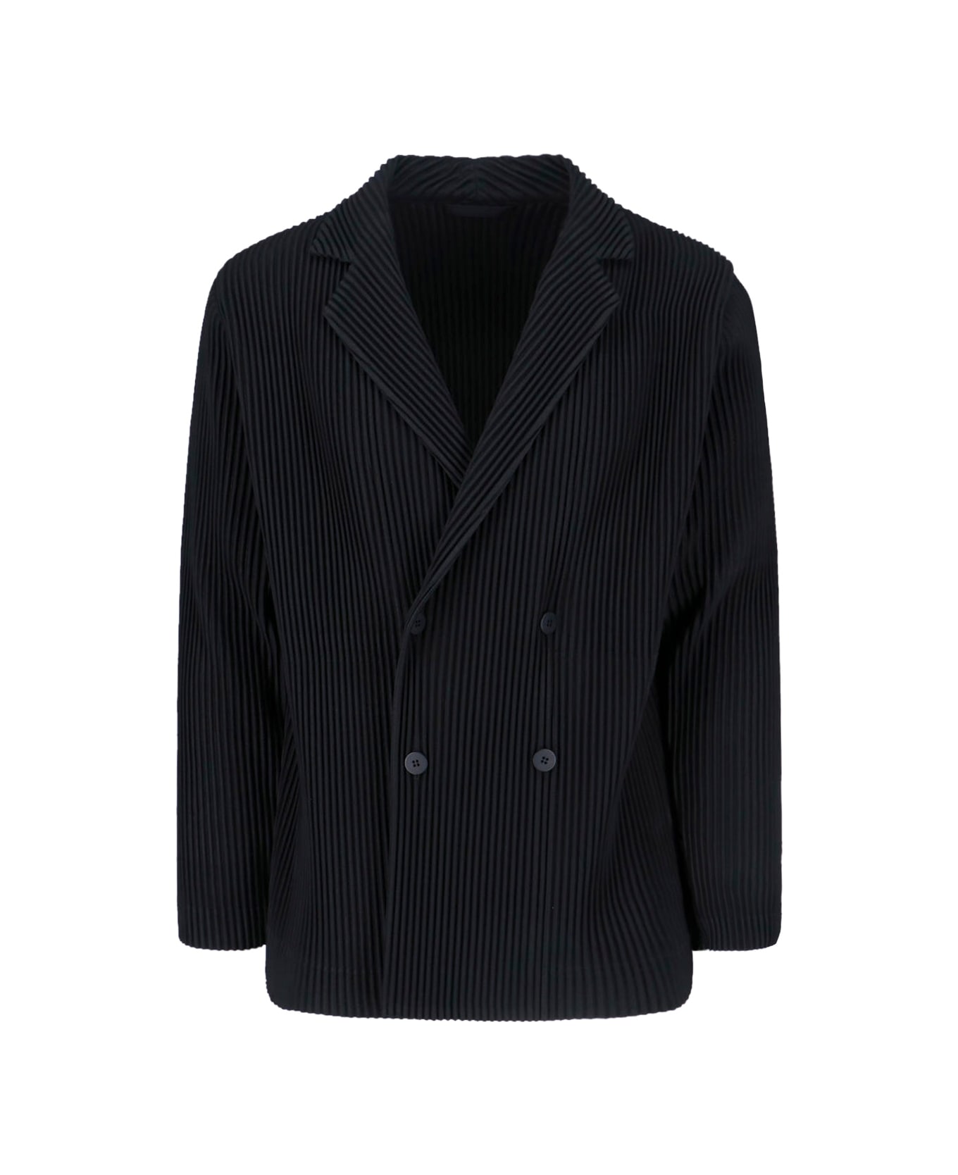 Homme Plissé pleated double-breasted blazer in black fabric, with lapels, long sleeves, and double-breasted button closure.
