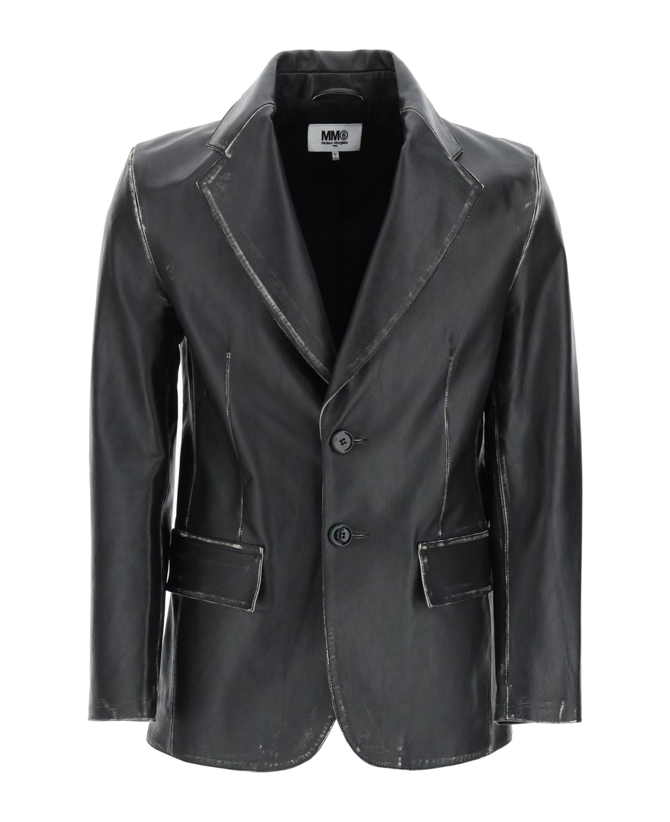 MM6 jacket made of calf leather, handcrafted and treated to provide a worn-out effect to the garment. It features notch-lapel collar, single-breasted button fastening and side flap pockets. Finished with rear center slit and with the signature stitching detail at back of the neck. Satin lining, with one inner pocket. Regular fit. The model is 187 cm tall and wears a size IT 48.