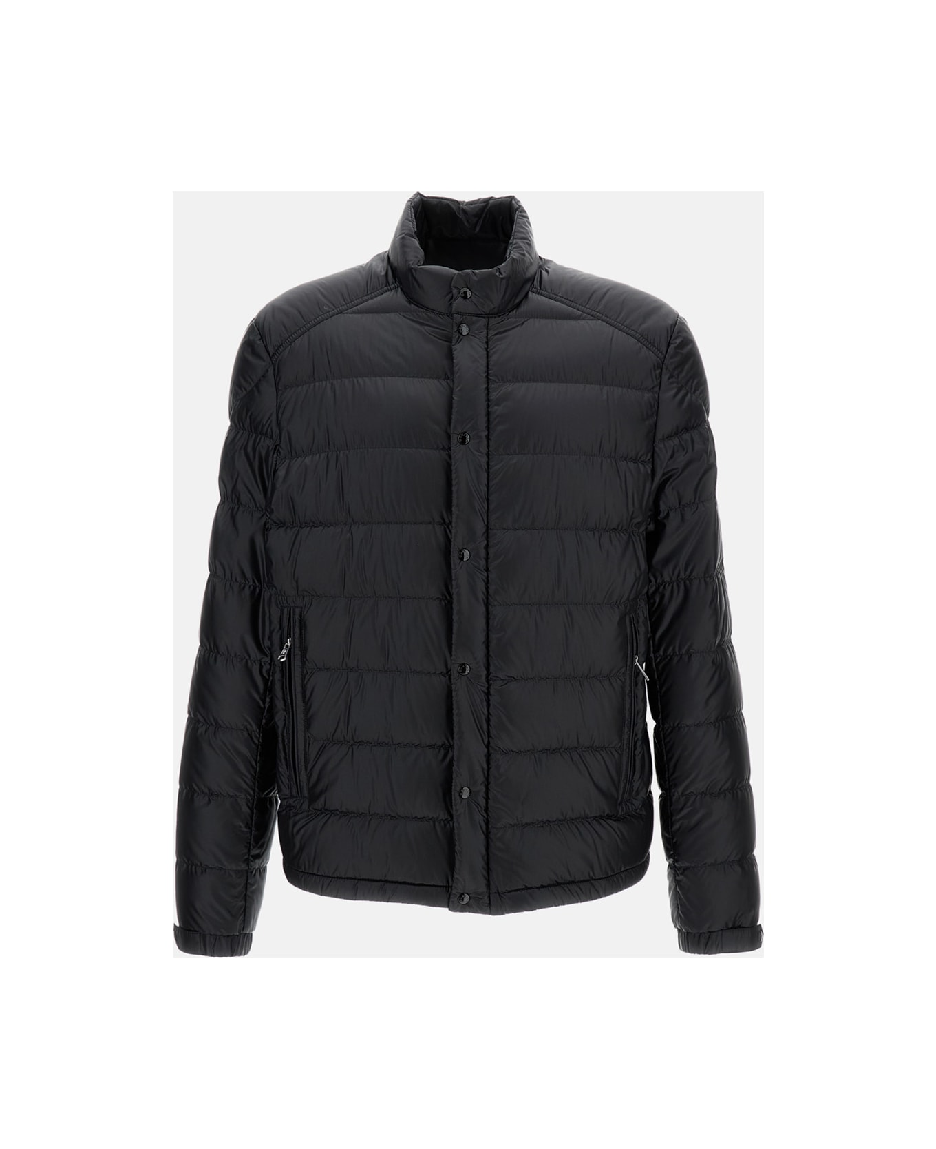 Padded and quilted jacket Logo on the arm Front double-slider zip closure Side pockets with zip Elastic cuffs Color: black