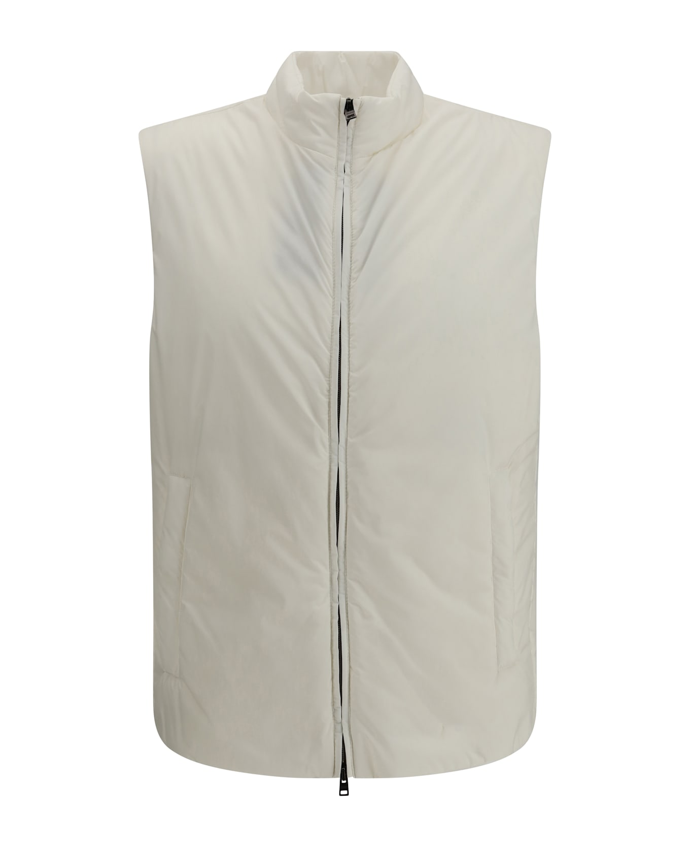 The vest by herno features a clean, contemporary silhouette with a shaped hem and a metal logo tag placed on the back of the collar. the front fastening includes a two-way zipper for added practicality and versatility, while the two side pockets with button closures complete the functional design. a lightweight and refined piece, perfect for adding a technical yet sophisticated layer to everyday looks.