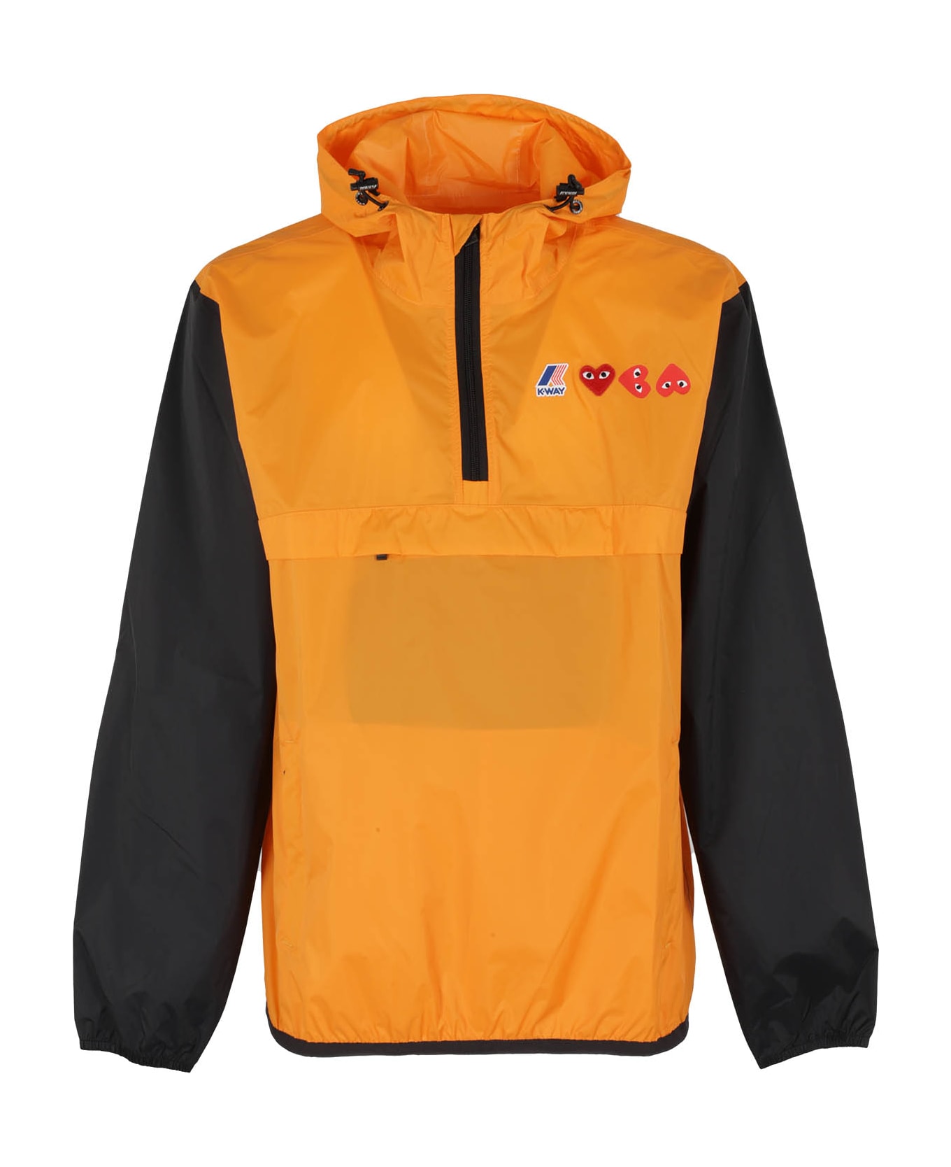K-Way Hoodie - Comme De Garcons Play X K-Way - Orange and black color - Regular fit model - Front zipper closure - Long sleeve - Drawstring hood - Side pockets - Straight hem - Logo print on chest.
