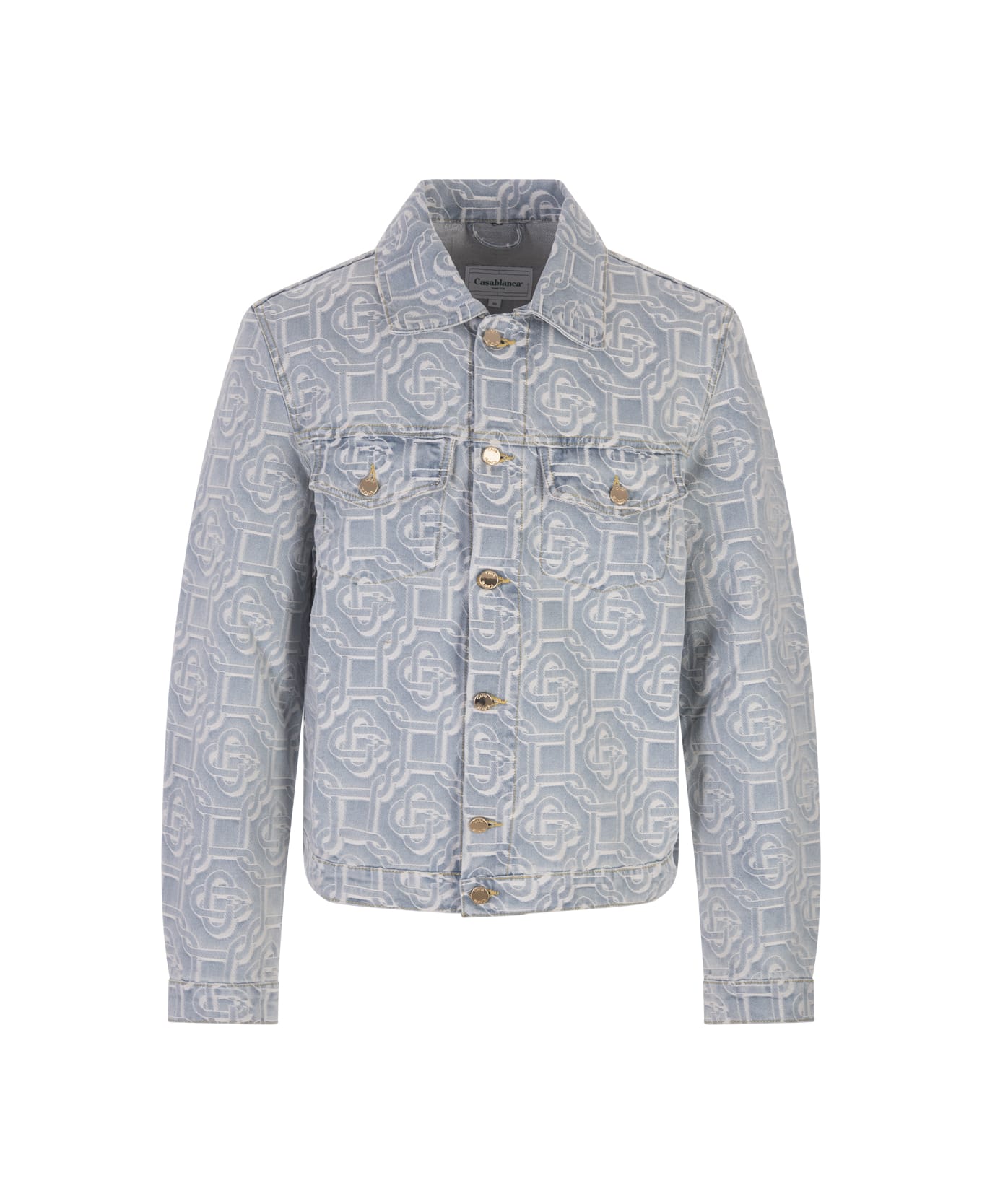 Casablanca jacket made of light blue washed organic cotton denim with all-over Casablanca monogram motif. It features a classic collar, long sleeves, button cuffs, two flap pockets to the chest and a front button fastening.