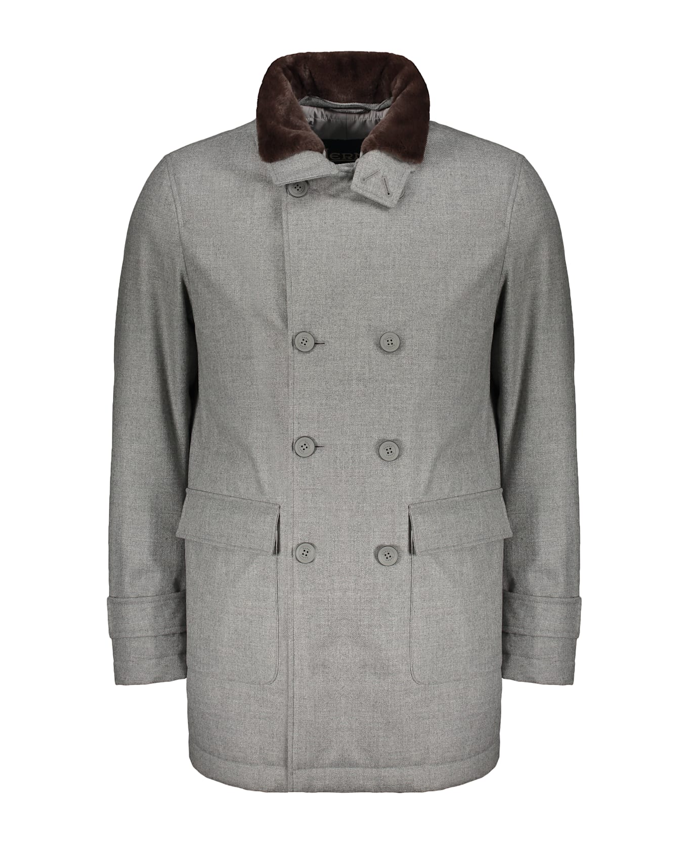 Elegant jacket with a double-breasted design, characterized by a soft gray color. it features a refined finish and a contrasting eco-fur collar that adds a touch of style. the long sleeves provide warmth and comfort, making it perfect for the mid-seasons. ideal for both formal and casual outfits, this jacket is a versatile piece to have in your wardrobe.