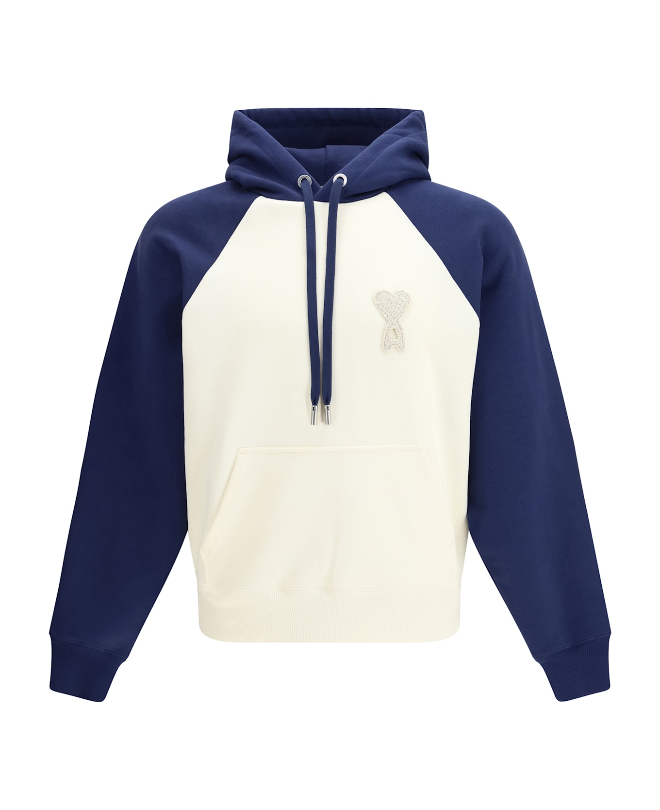 The ami de coeur hoodie in heavy two-tone cotton loopback knit with long sleeves by ami paris features a unisex boxy cut with raglan sleeves that enhance its relaxed contemporary silhouette. the crocheted ami de coeur appliqué on the chest adds a distinctive handcrafted touch, while the tonal ami signature at the back neckline completes the design with subtle refinement. the structured construction elevates comfort and identity, making this hoodie by ami paris an iconic piece with modern character.