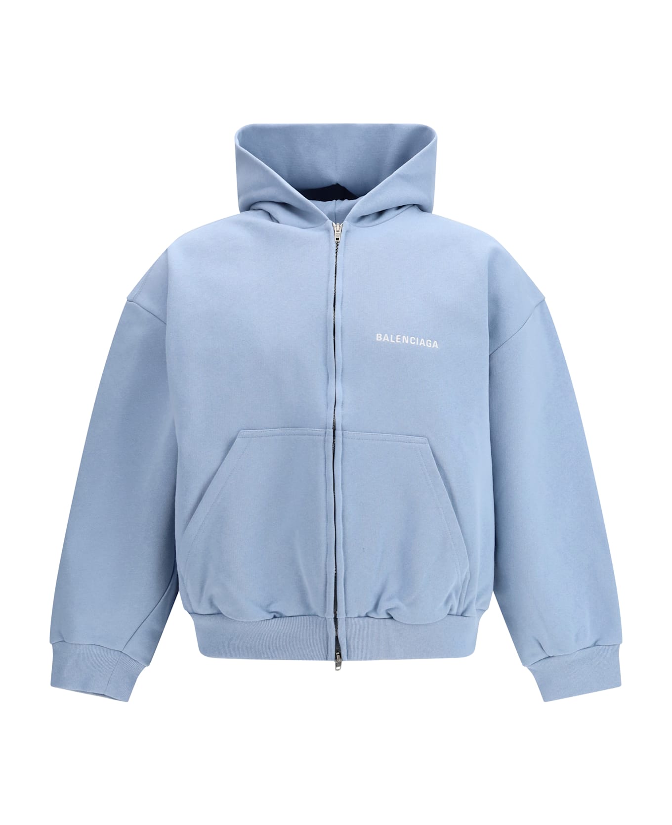 The back zip-up hoodie by balenciaga in a regular fit is crafted from dry fleece, offering comfort and structure for everyday wear. the design features a drawstring-free hood and soft shoulders, creating a relaxed yet balanced silhouette. a two-way front zip closure enhances functionality, while two front pockets add practicality. the cuffs and hem are slightly fitted to ensure a secure fit. the balenciaga back embroidery on both the front and back completes the piece with an iconic and instantly recognizable signature.