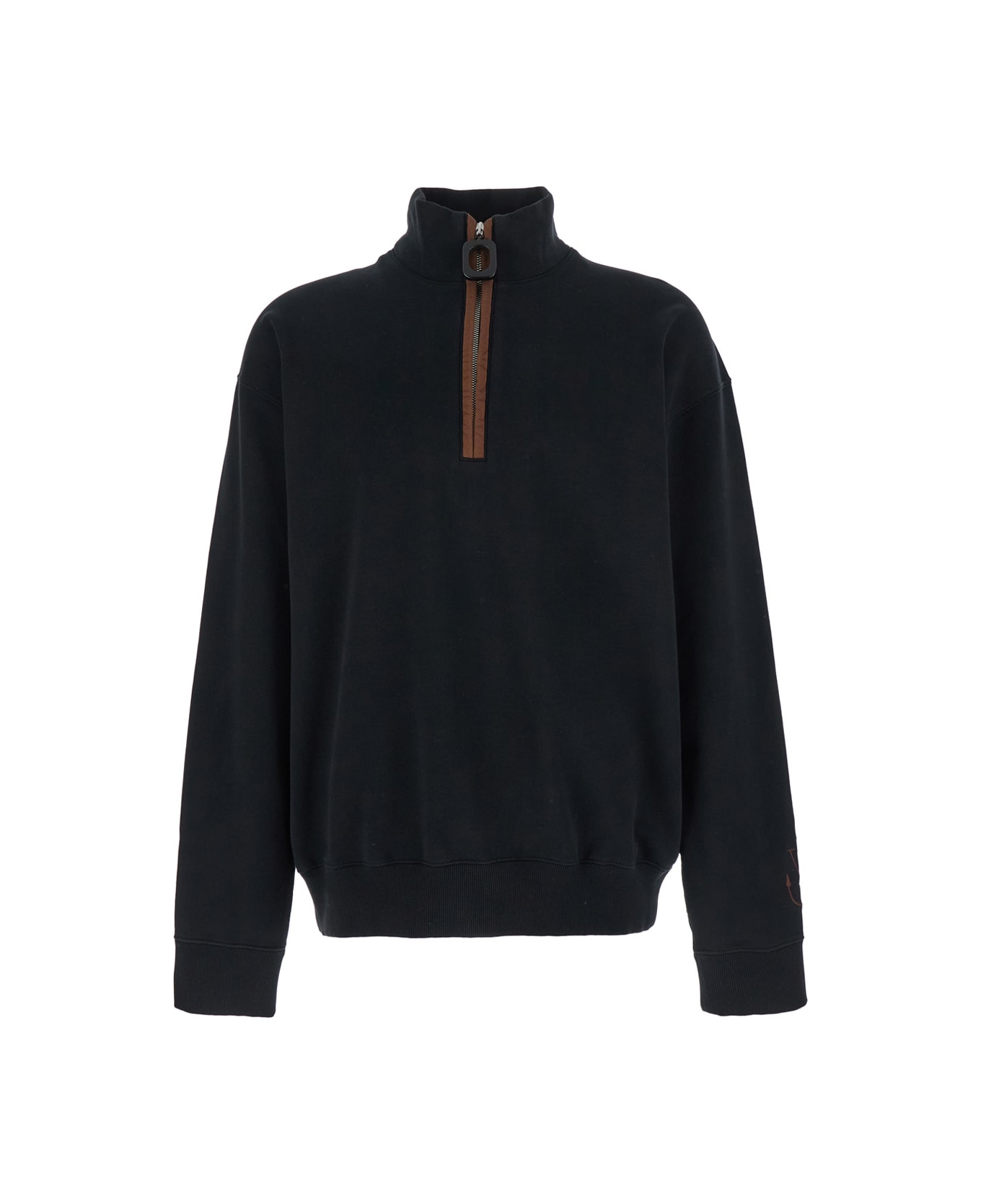 Sweatshirt Black High neck Long sleeves Front zip closure Dropped shoulders Embroidered logo on the sleeve Ribbed hem and cuffs Cotton Loose fit