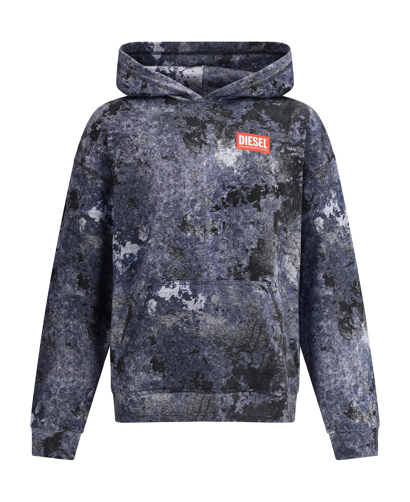 Diesel's cotton s-boxt-hood-r8 hoodie is a piece with an urban, contemporary look. featuring a practical and functional kangaroo pocket, it features an appliquéd iconic monogram patch on the front, underscoring its authenticity. ribbed cuffs and hem ensure a comfortable, finished fit. the marbled effects, inspired by acid-wash denim washes, and the dévoré treatment create a distinctive, worn-in look, adding a touch of originality to the design.