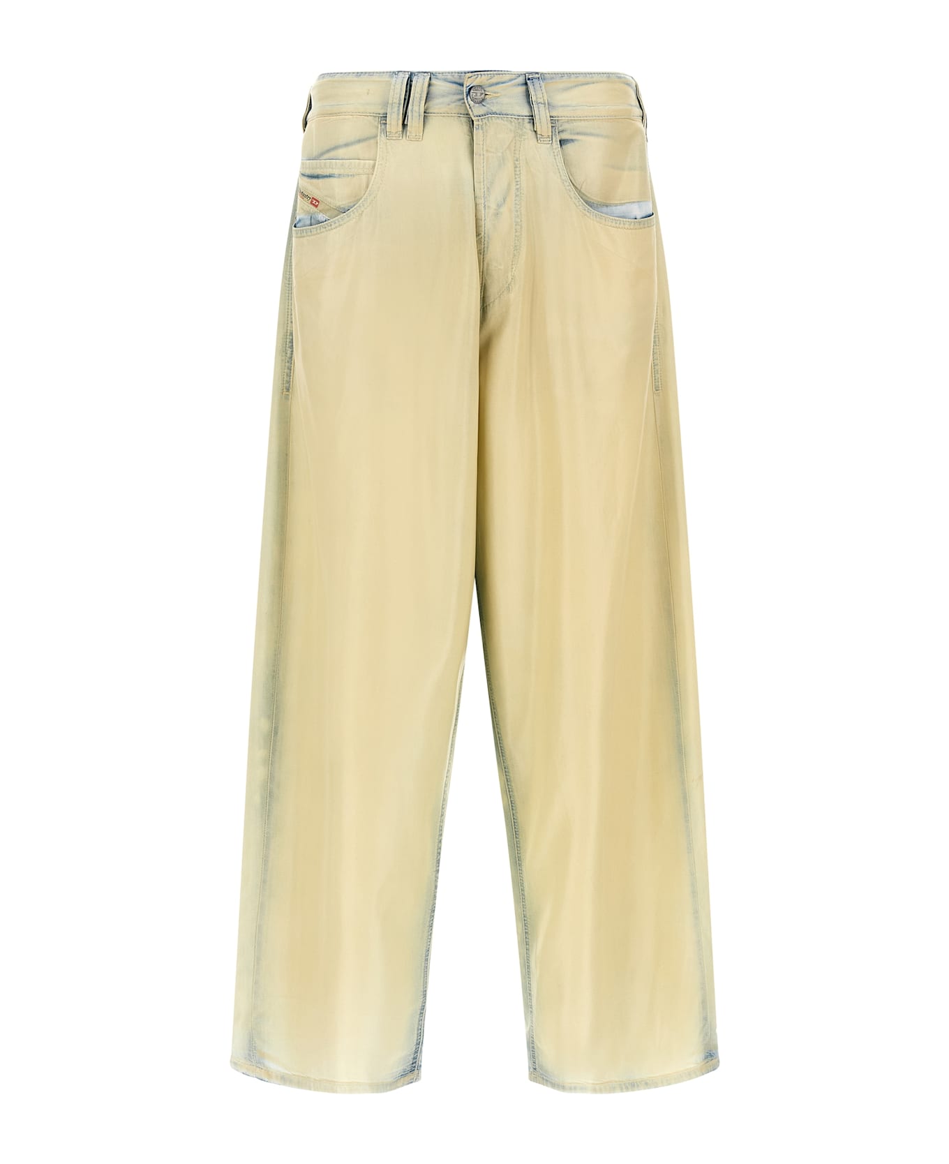 '1997 D-Enim-M' pure lyocell jeans defined by an exclusive 'X-Ray' bleaching technique, mid waist, low crotch, wide leg, front button closure, five pockets, back logo tag. 'X-Ray' bleaching: The garment is turned upside down, exposing inner linings and double seams, and enriched by manual processing: folding, a colored coating and repeated pressing generate a luminous patina. Indigo dyed yarns discolor along with the fabric, creating a natural gradient look. Entirely distressed in Italy, each garment has unique details.