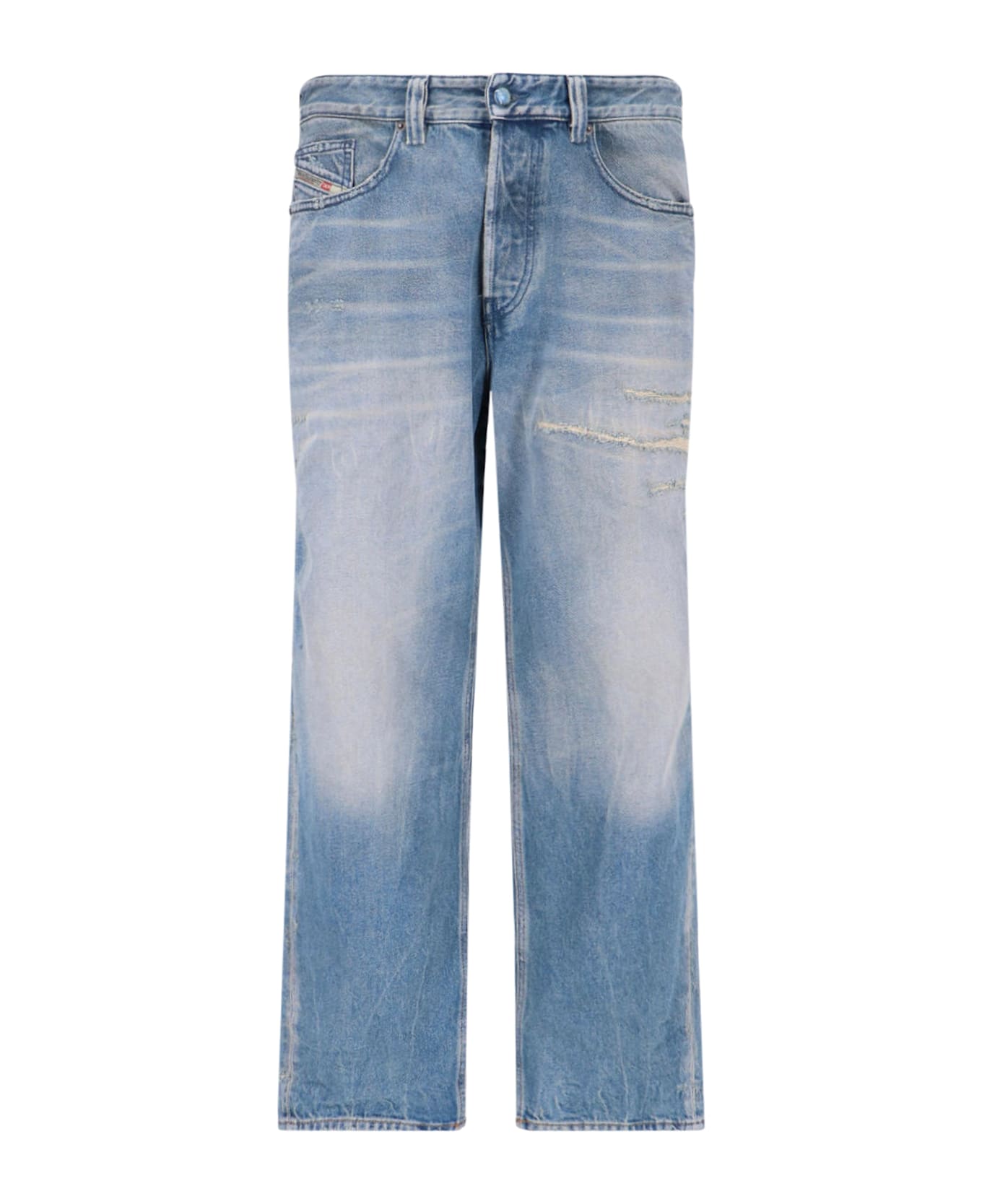 Diesel straight '2024 d-macs 09n30' blue cotton denim jeans with distressed wash, mid waist, button closure, belt loops, five pockets, multicolor logo tag on the front, side logo patch, destroyed detail on the front, straight leg. Composition: 100% Cotton