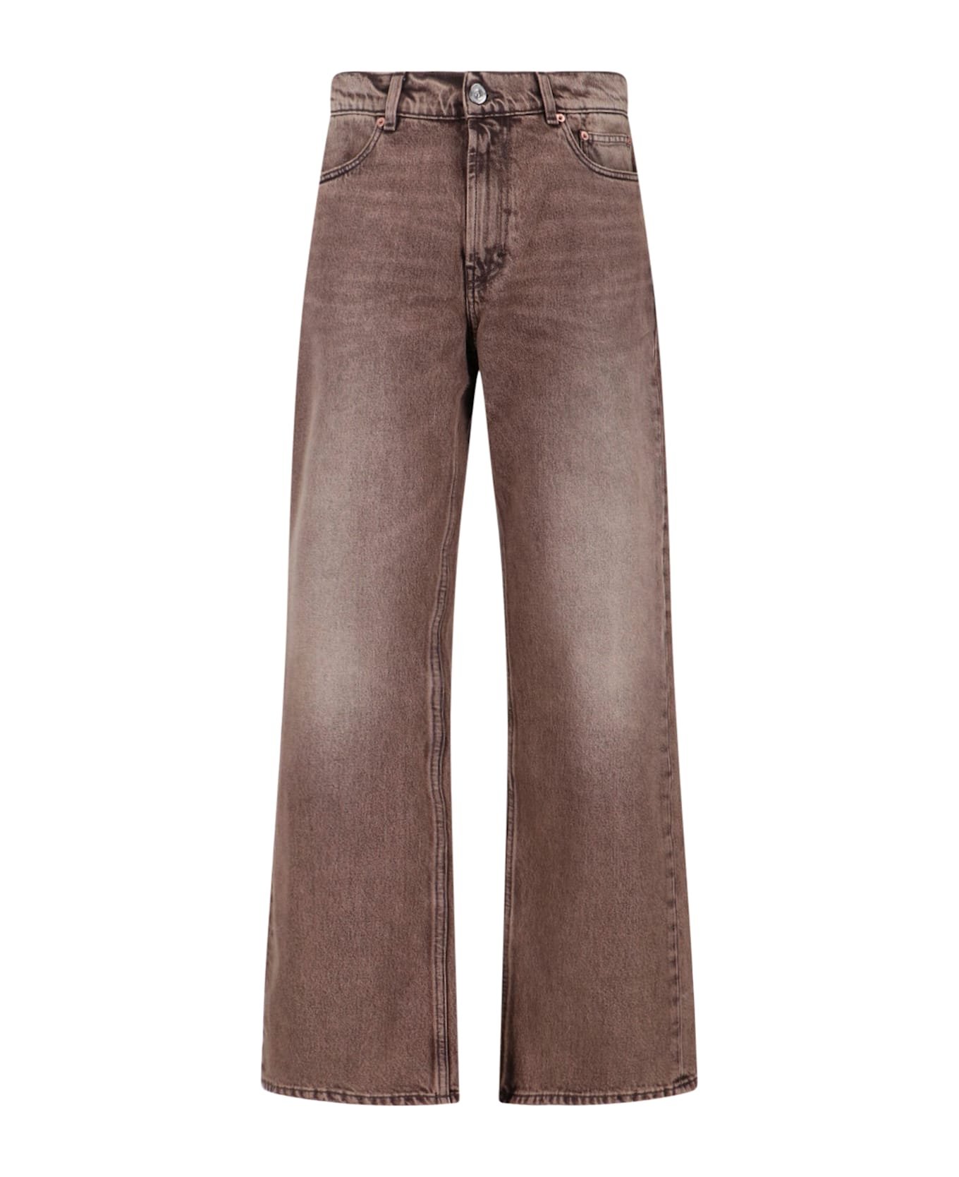 Our legacy 'Wata' jeans in brown organic and recycled cotton denim with distressed wash, high waist, belt loops, button and zip closure, two side pockets, rubber logo patch at the back, two back pockets, straight leg.