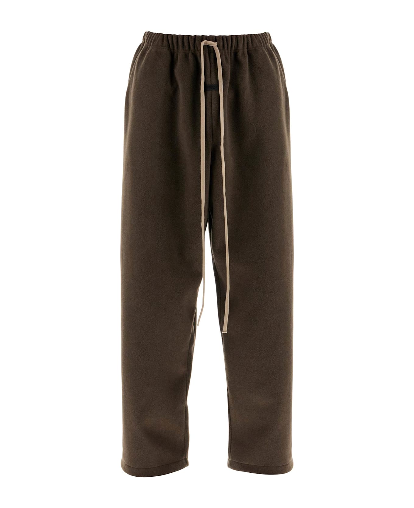Oversized joggers from the Fear Of God Essentials collection, made of heavy fleece with an elastic waistband and drawstring. They feature slanted pockets on the sides and a rubber logo label on the front. The model is 182 cm tall and wears size M.