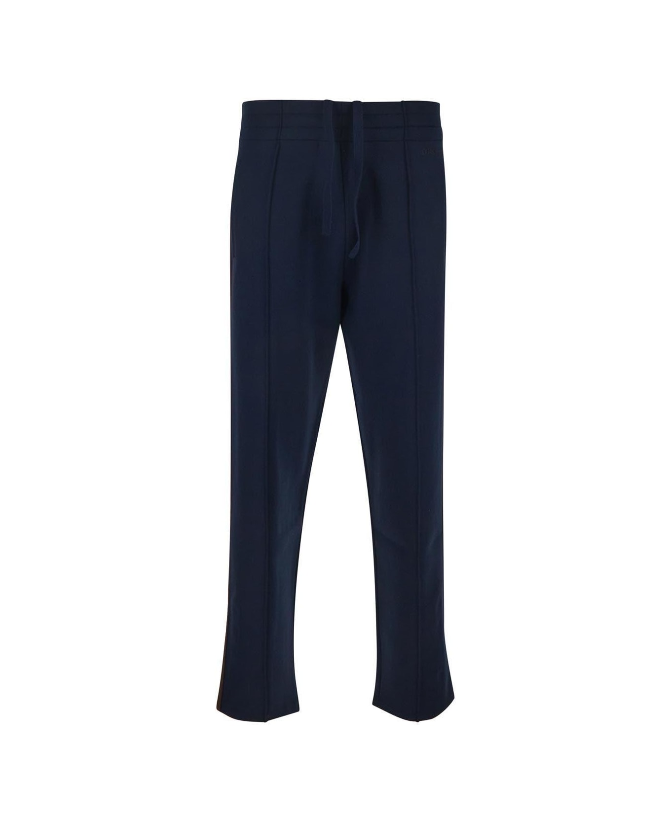 Burberry trousers in navy blue viscose with brown, white and burgundy lines on the sides, elastic waistband with coulisse, black embroidered logo on a front side, two side zipped pockets, bottom hems with zip closure and stitched central line. Composition: 49% Viscose, 37% Polyester, 13% Polyamide, 1% Elastane