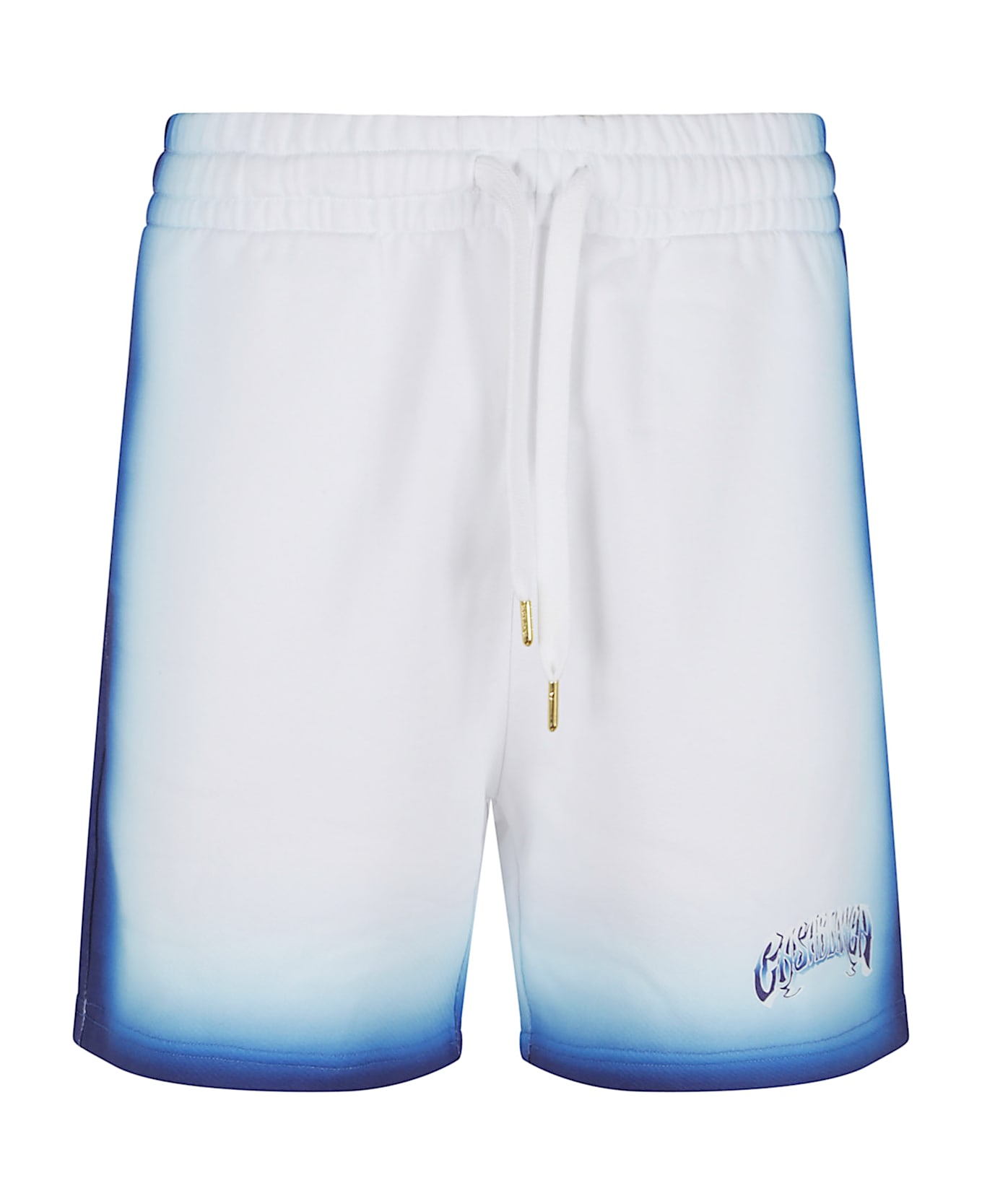Blue Fade organic cotton shorts by CASABLANCA. Elastic waistband with gold-tipped drawstring; in-seam side pockets and a back patch pocket. Features hand-drawn Casablanca logo typography, inspired by gothic tattoo fonts, and contrast piping.